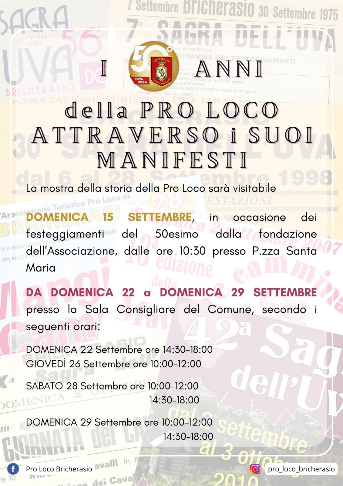 I festeggiamenti in occasione del 50° anniversario di fondazione della Proloco di Bricherasio, si svolgono nell'ambito della 56^ Sagra dell’Uva, Domenica 15 settembre. Il programma prevede dalle ore 9 il ritrovo delle Associazioni e dei Gruppi partecipanti con i propri labari, la Santa Messa nella chiesa parrocchiale delle 10,30 alla quale segue l’aperitivo in Piazza Santa Maria. Alle ore 13 il pranzo presso la sede della Pro Loco “Severino Morero”, in Piazza Don Vittorio Morero, al costo di 40 € per gli adulti, 25 € per i bambini (gratuito fino a 4 anni). Per prenotarsi al convivio entro lunedì 9 settembre chiamare il numero 340.5841326. Alberto Godino, Presidente dell’Associazione bricherasiese esordisce ricorda che la mostra per il compleanno attraverso i propri manifesti sarà visitabile la Domenica dell’anniversario nella sede della Pro Loco e successivamente verrà spostata nella Sala Consiliare del Comune da Domenica 22 a Domenica 29 settembre.