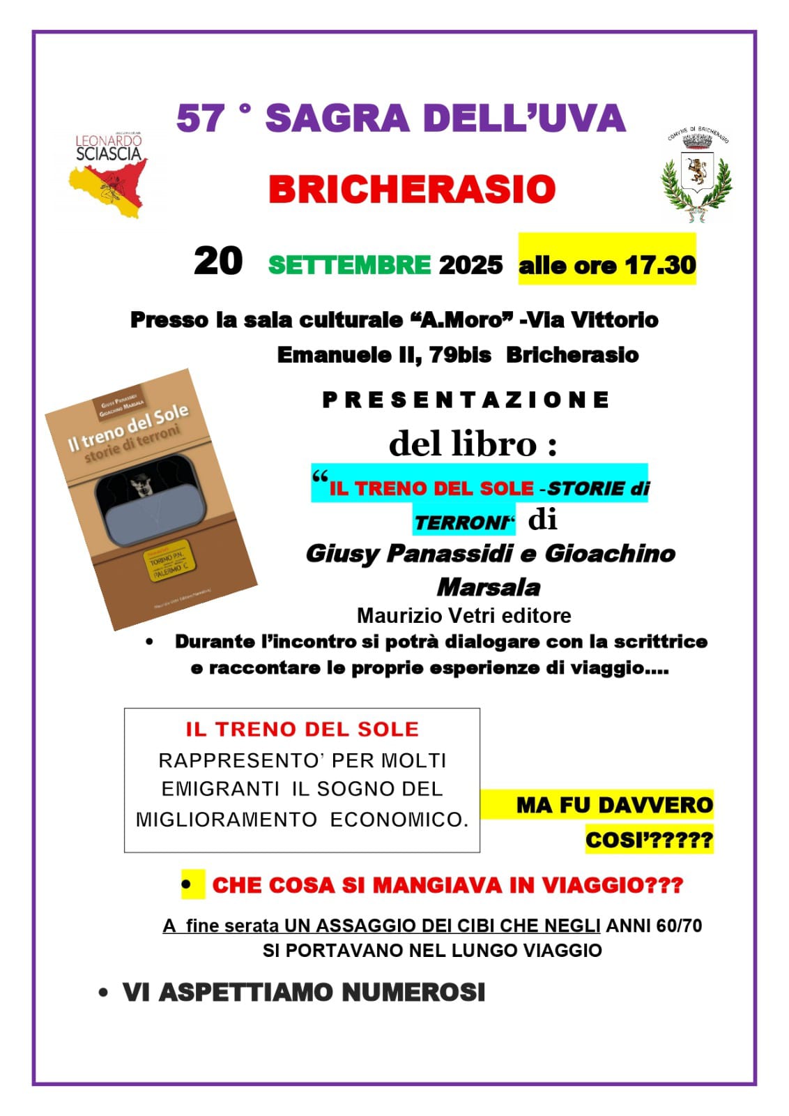 La Sagra dell'Uva di Bricherasio, nel più ampio contesto del "Settembre Bricherasiese" giunge nel 2025 alla sua 57° edizione. Al consueto ricco programma di eventi culturali, enogastronomici, musicali e sportivi si aggiunge quest'anno il ricordo dei 700 anni dalla fondazione della "Villanova" di Bricherasio, ovvero l'edificazione del nuovo abitato medievale, nella sede attuale, su iniziativa del principe Filippo d'Acaia. Gruppi, esibizioni, giochi e rievocazioni storiche a tema medievale arricchiranno così il lungo mese di settembre, da sempre dedicato alla festa per i prodotti della terra e per la vendemmia. Qui di seguito il programma completo, in graduale aggiornamento, e lelocandine specifiche dei vari eventi previsti.