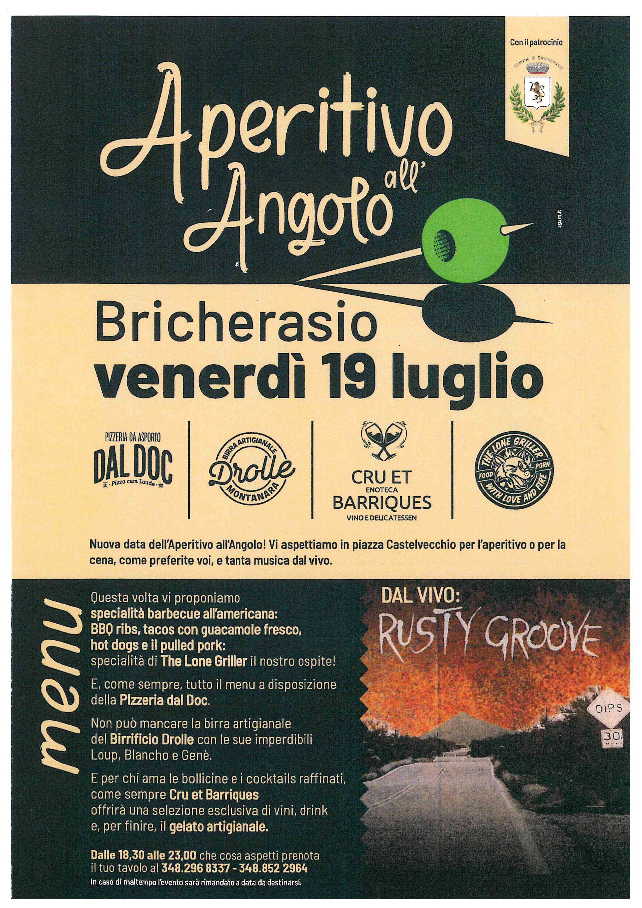 Venerdì 19 luglio quarto appuntamento a Bricherasio con l’Aperitivo all'angolo in Piazza Castelvecchio, per cenare ed ascoltare la musica dal vivo del guppo Rusty Groove, rock band dronerese. L'organizzazione è a cura dalla Pizzeria Dal Doc, il bar Cru et Barriques ed il birrificio Drolle. A partire dalle ore 18.30 si possono trovare barbecue all’americana, tacos con guacamole, hot dog e pulled pork¸ specialità dell’ospite The Lone Griller.