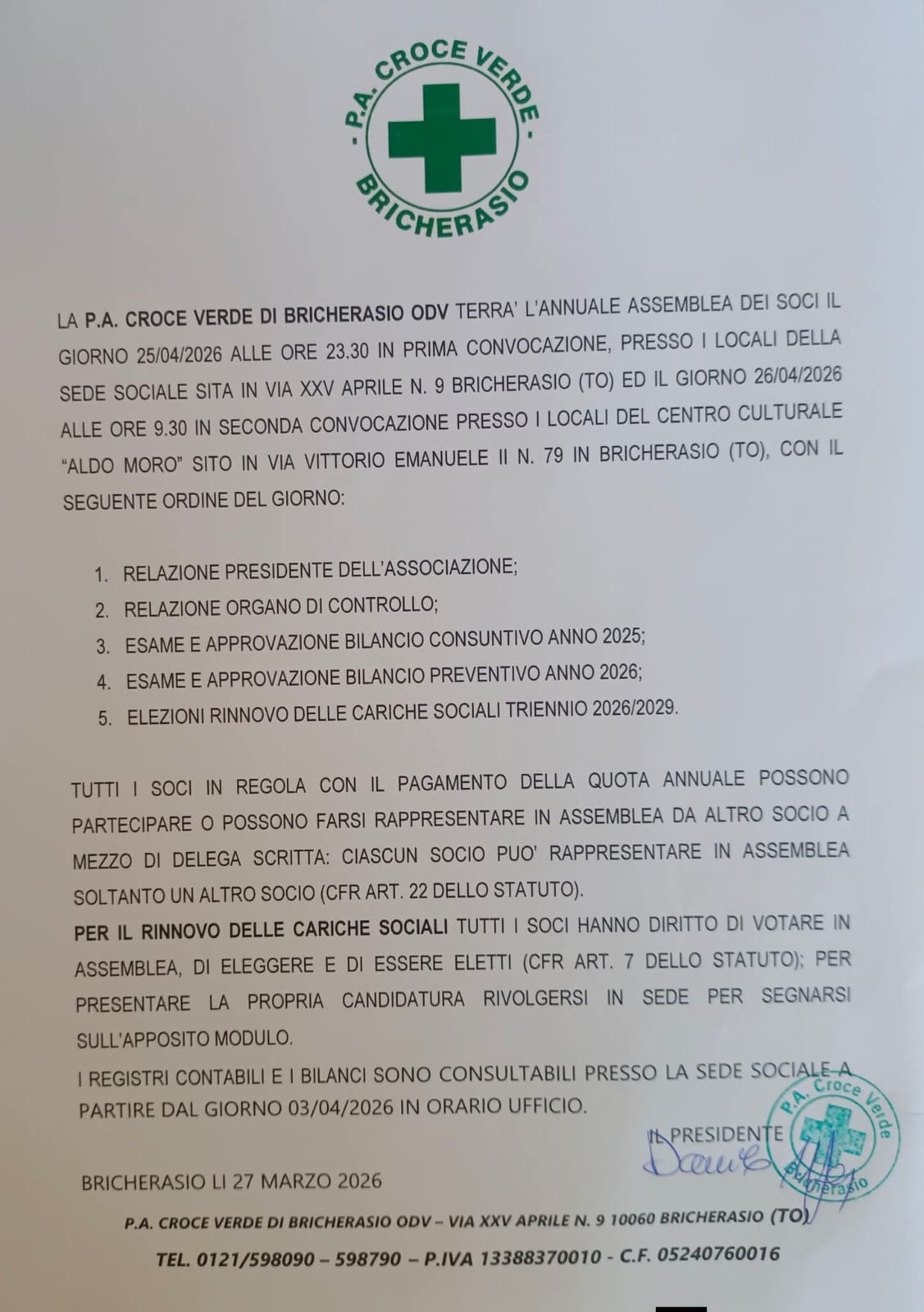 L’assemblea annuale dei soci della Croce Verde di Bricherasio è convocata per Domenica 26 aprile alle ore 9,30 nella sede con le importanti elezioni per il rinnovo delle cariche sociali.