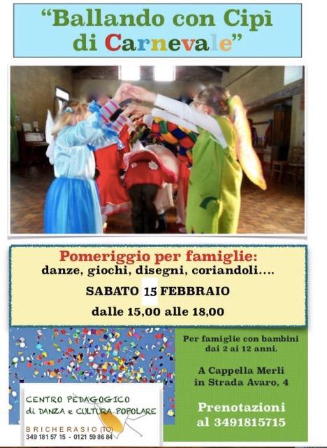 In occasione del Carnevale il Centro Pedagogico di Danza e Cultura Popolare di Strada Avaro, 4 nella frazione Cappella Merli a Bricherasio propone sabato 15 febbraio con inizio alle ore 15, un pomeriggio per famiglie con bambini dove si può danzare, giocare, disegnare e lanciare coriandoli,