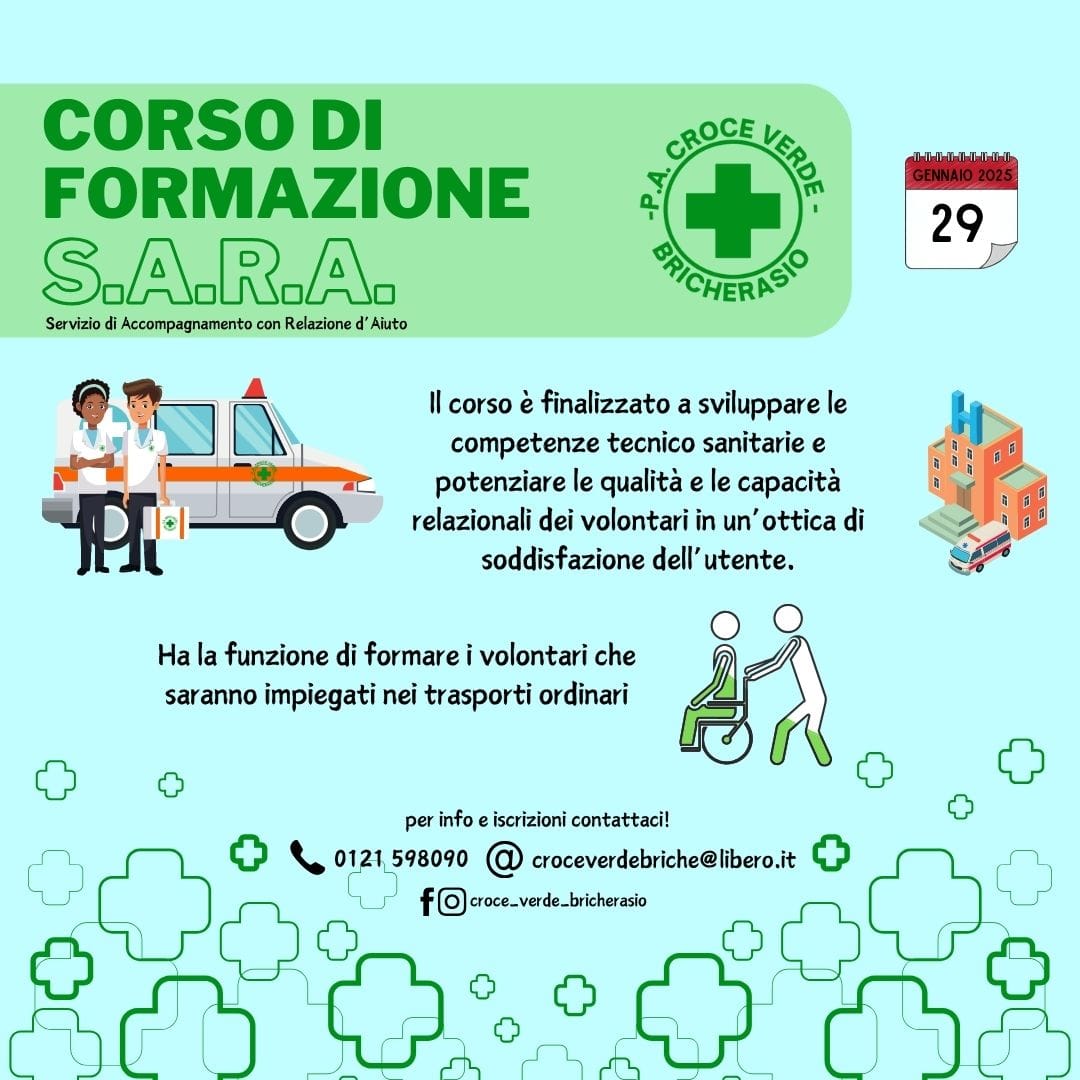La Croce Verde di Bricherasio comunica che è stato diramato il calendario del corso di formazione S.A.R.A., il servizio di accompagnamento con relazione di aiuto. Le lezioni si svolgono nella sede della Croce Verde a partire dal 29 gennaio e si articolano in otto incontri il mercoledì dalle ore 9 alle 13 e il sabato dalle 9 alle 18 e termineranno sabato 22 febbraio con la giornata di certificazione. Durante il corso si approfondirà sia l’aspetto sanitario che quello relazionale e di comunicazione con attività di mobilizzazione atte a sviluppare le competenze tecnico sanitarie e potenziare le qualità e le capacità relazionali dei volontari impiegati nei servizi ordinari. Per qualsiasi informazione contattare la Croce Verde di Bricherasio al numero 0121.598090, rivolgersi in sede oppure consultare facebook alla pagina della Croce Verde .