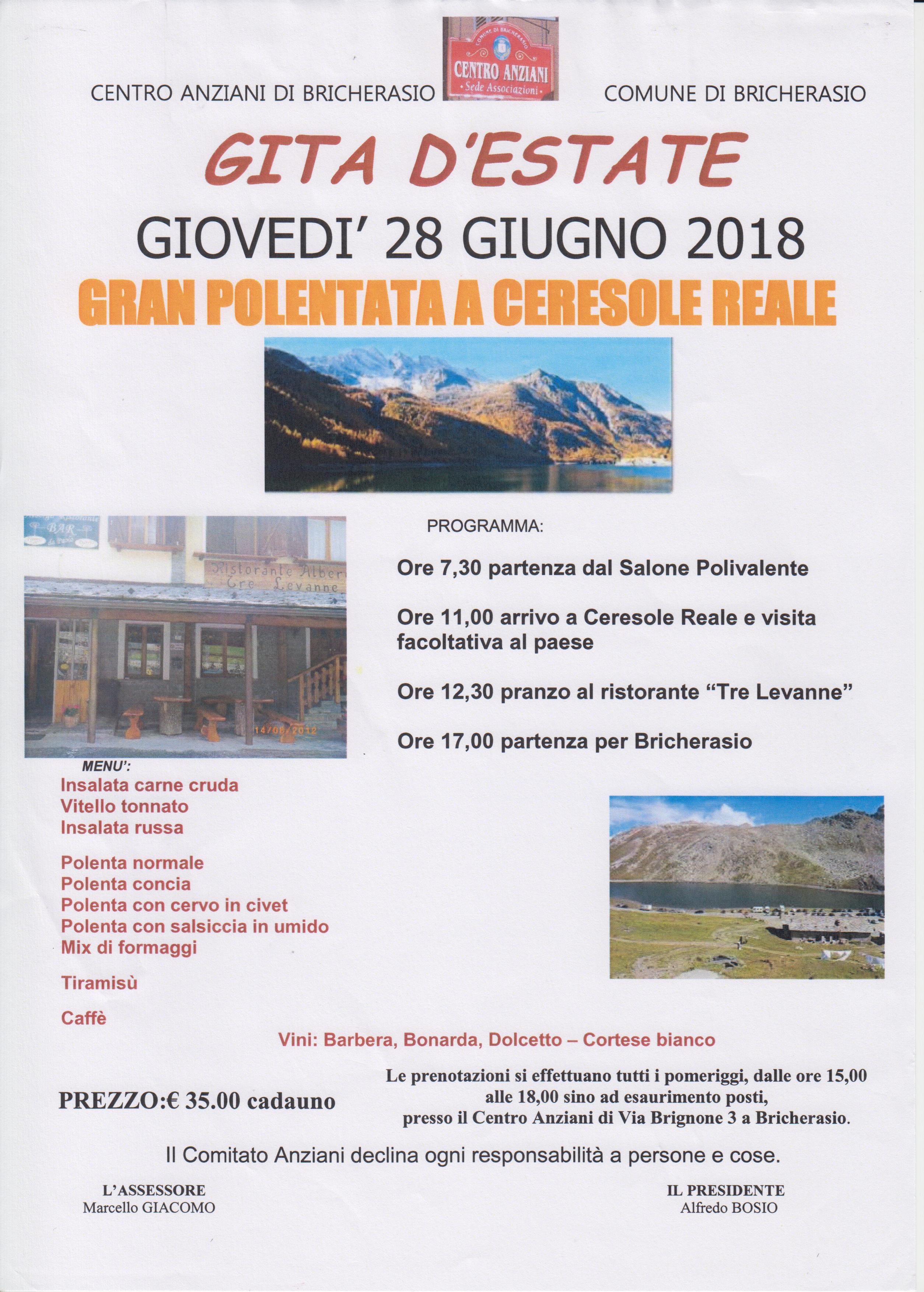 Il Centro Anziani di Bricherasio, in collaborazione con il Comune, organizza la gita d’estate per la tradizionale polentata giovedì 28 giugno a Ceresole Reale. Il programma prevede alle ore 7,30 la partenza dal Salone Polivalente di Piazza Don Morero di Bricherasio, e l’arrivo a Ceresole Reale alle 11 per la visita facoltativa al paese. A seguire il pranzo al ristorante “Tre Levanne”. Alle 17 il commiato per il ritorno a Bricherasio. Informazioni e prenotazioni fino ad esaurimento dei posti tutti i pomeriggi, dalle ore 15,00 alle 18,00 presso il Centro Anziani di Via Brignone, 3 a Bricherasio oppure telefonando ai numeri 0121/598546 oppure 339/3143038. Il costo è fissato in € 35 a persona.