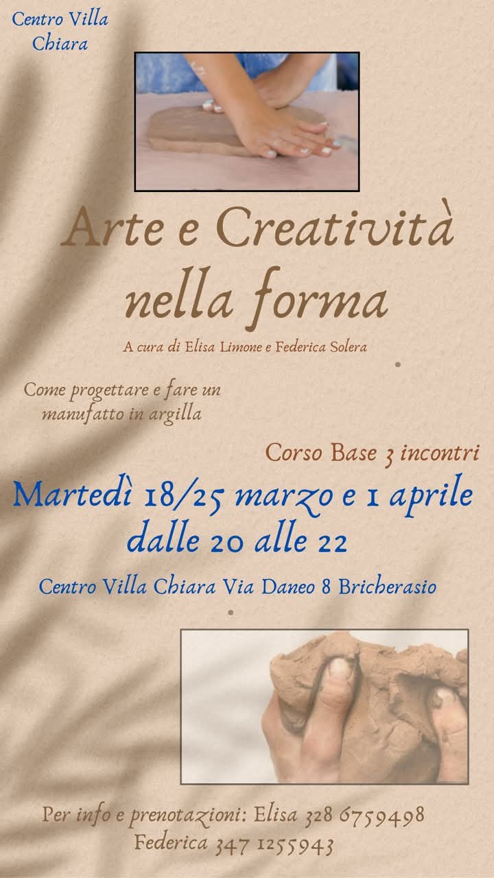L’Associazione Villa Chiara in Via Daneo, 8 a Bricherasio propone un mini corso di tre incontri per conoscere un materiale davvero interessante, malleabile, modellabile e di facile utilizzo: l’argilla. Il corso si svolge dalle ore 20 alle 22 al proprio centro a partire da martedì 18 marzo e si prosegue il 25 dello stesso mese e termina il 1 aprile. Per informazioni e prenotazioni telefonare a Federica al numero 3471255943 oppure Elisa al 3286759498.