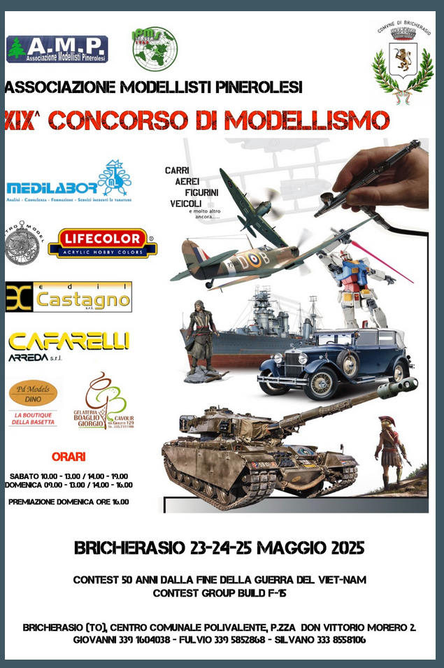 Al Salone Polivalente di Piazza Don Morero a Bricherasio sabato 24 e Domenica 25 maggio la diciannovesima Mostra Concorso di Modellismo Statico, organizzata dall’Associazione Modellisti Pinerolese. La mostra sarà aperta al pubblico sabato 24 dalle 10,30 alle 12,30 e il pomeriggio dalle 14,30 alle 19,30 e Domenica 25 la mattina dalle 10,30 alle 12:30 e dopo pranzo dalle 13.30 alle 17.30. L’ingresso alla manifestazione è gratuito e