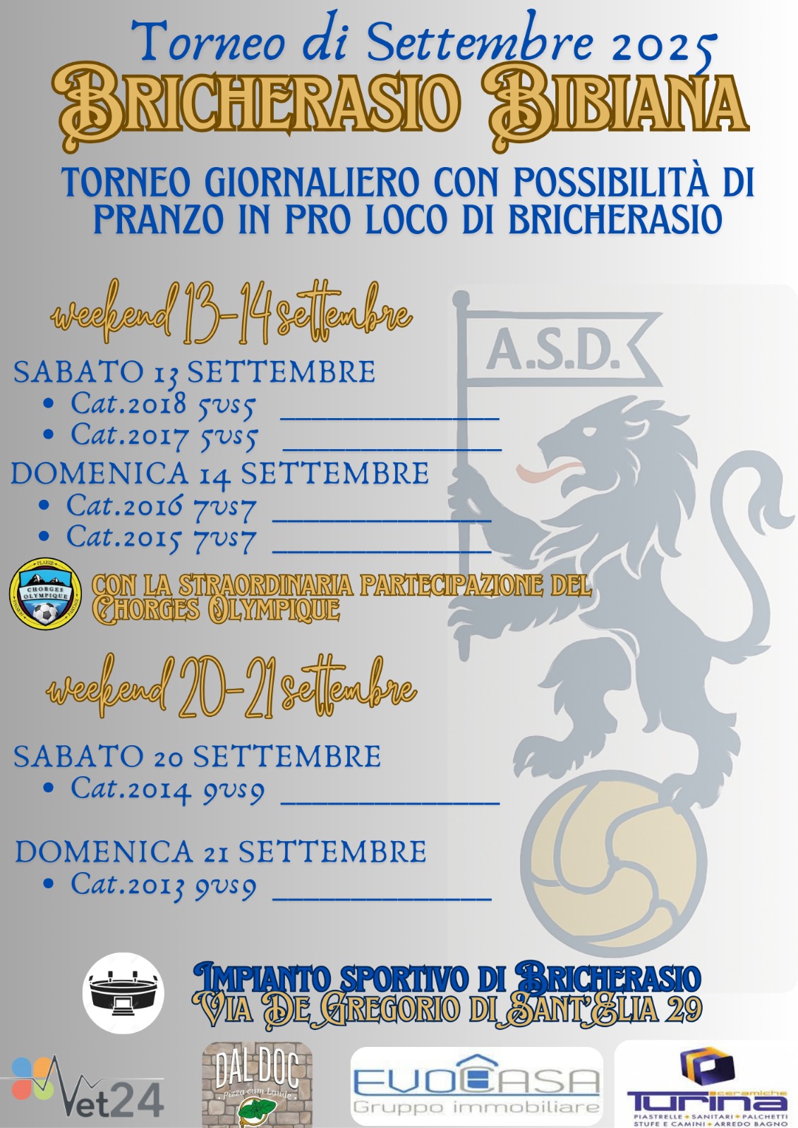Sabato 13 settembre e Domenica 14 agli impianti sportivi “Calleri di Sala” in Via De Gregorio di Sant’Elia, 29 non può mancare il torneo giovanile di calcio "Comune di Bricherasio" organizzato dalla locale società sportiva e giunto alla 35^ edizione. Scendono sul rettangolo di gioco le categorie Primi Calci 2017 e 2018 sabato 13 e chiudono il weekend le due categorie dei Pulcini 2016 e 2015 che calpestano il terreno di gioco Domenica 14.