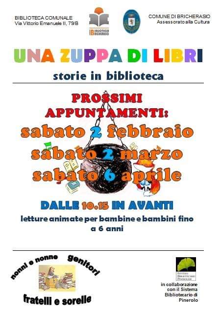 Sabato 6 aprile dalle ore 10.15 torna "Una zuppa di libri", l'appuntamento mensile in biblioteca per i più piccoli e le loro famiglie. Organizza la biblioteca bricherasiese in collaborazione con il Sistema Bibliotecario di Pinerolo.