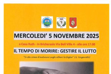 Evento passatoMercoledì 5 novembre a partire dalle ore 17 la cohousing "Casa Ruth", in Via Bell Ville 4 a Bricherasio, presenta l’incontro “Il tempo di morire: gestire il lutto” con il medico di medicina...