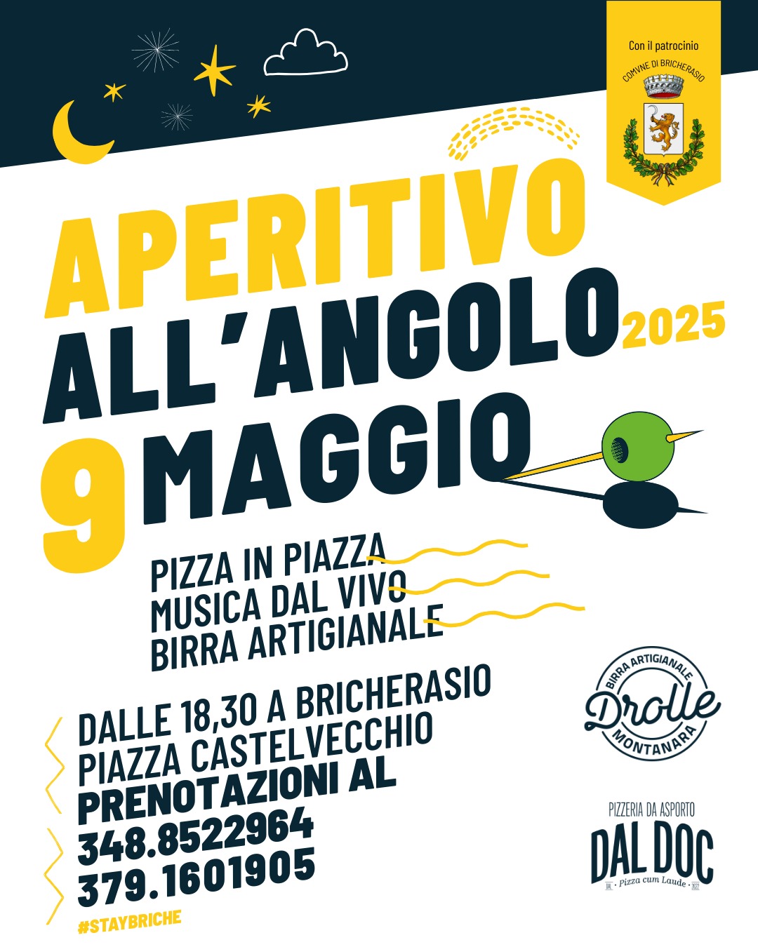 Dopo il grande successo di partecipanti dell’anno scorso tornano gli appuntamenti primaverili ed estivi a Bricherasio con l’Aperitivo all'angolo in Piazza Castelvecchio organizzato dalla Pizzeria Dal Doc e dal Birrificio Drolle per la sera di venerdì 9 maggio. A partire dalle ore 18,30 si possono trovare gnocchi, patate, focacce e pizze proposte da Dal Doc e le birre artigianali fornite dal Birrificio Drolle. Per prenotazioni: 3488522694 oppure il 3791601905.
