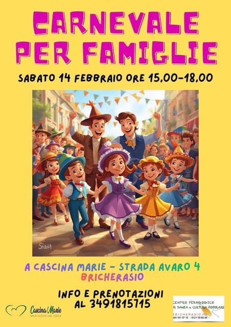 Il Centro Pedagogico di Danza e Cultura Popolare di Strada Avaro 4 nella frazione Cappella Merli a Bricherasio organizza, in occasione del Carnevale, per sabato 14 febbraio, con inizio alle ore 15, un pomeriggio per famiglie con bambini per danzare, giocare, disegnare, tirare coriandoli e tutto quello che serve per fare festa. Per informazioni e prenotazioni telefonare a Maria Baffert al numero 349/1815715.