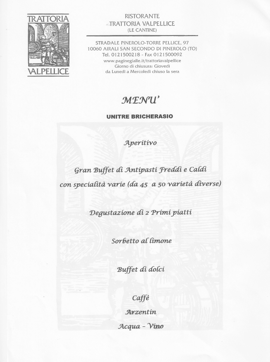 L’Università delle Tre Età di Bricherasio, conclusa l’attività del 16º anno accademico, festeggia con la Cena Sociale in programma Domenica 6 aprile alle ore 20.00 presso la Trattoria Val Pellice di San Secondo di ‘Pinerolo. La realtà è in continua evoluzione, aumentano sia le materie proposte e le conferenze sia gli allievi che mostrano grande interesse e partecipazione. Per valutare insieme il lavoro svolto e per impostare quello del prossimo anno il Direttivo dell’Unitrè ha organizzato l’open buffet con la partecipazione dei docenti. Informazioni e prenotazioni presso il Presidente Annamaria Garzena, tel 0121/598190, o da Schena Giuseppe allo 0121/598068 oppure da Boggiatto Carla al numero 0121/598509 e si ricorda che all’indirizzo http://www.unitrebricherasio.it si possono reperire informazioni utili sull’attività dell’Associazione di Bricherasio.