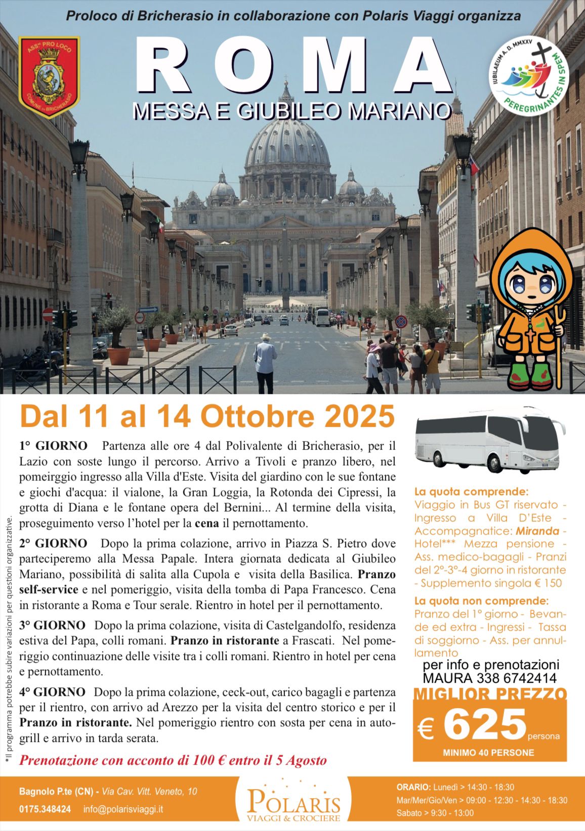 Scadono martedì 5 agosto le prenotazioni per partecipare alla gita a Roma dall'11 al 14 ottobre organizzata dall’Associazione Pro Loco di Bricherasio in collaborazione con Polaris Viaggi, in occasione del giubileo mariano. La quota di partecipazione comprensiva di viaggio in autobus, pernottamento in hotel 3 stelle, accompagnatrice è di 625 € a persona. Per informazioni e iscrizioni rivolgersi a Maura telefonando al numeri 338 6742414.