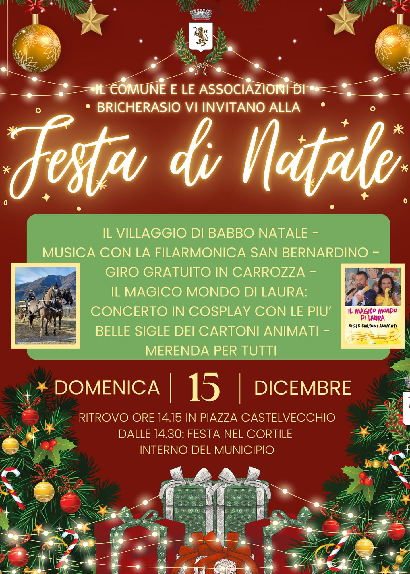 Domenica 15 dicembre, con ritrovo alle ore 14,15 in Piazza Castelvecchio e a seguire dalle ore 14,30 nel cortile di Babbo Natale all’interno del Municipio di Bricherasio, il Comune e le Associazioni vi invitano alla grande festa di Natale per piccoli ed adulti. Si potrà trascorrere un pomeriggio ricco di divertimento con l'arrivo di Babbo Natale in carrozza, la visita del villaggio di Babbo Natale, la musica della Filarmonica San Bernardino, giro gratuito in carrozza, il concerto in cosplay con le più belle colonne sonore dei cartoni animati e l’immancabile merenda offerta a tutti i partecipanti.