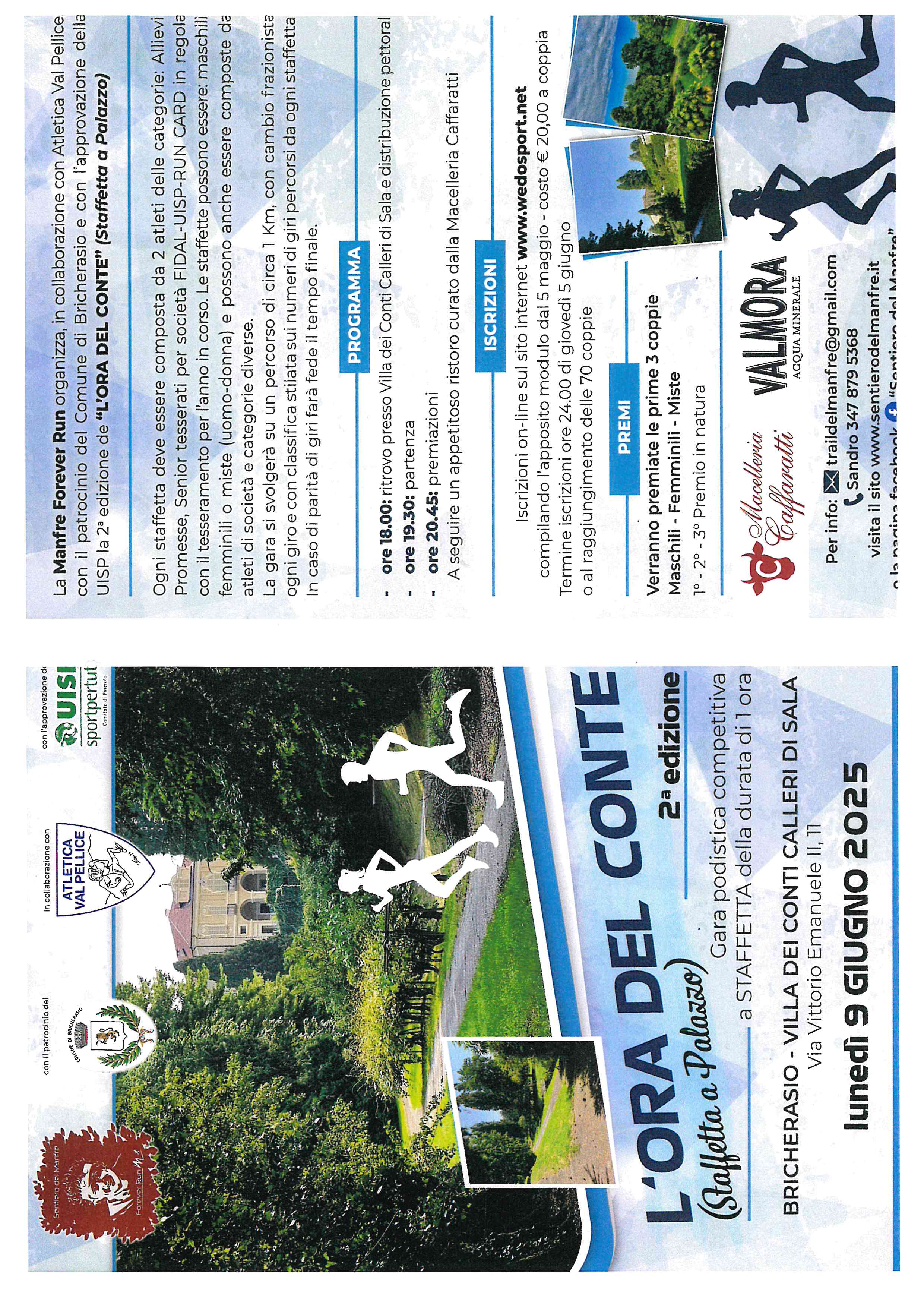 La Manfre Forever Run presenta, in collaborazione con l’Atletica Val Pellice, il patrocinio del Comune di Bricherasio e l’approvazione della UISP la 2^ edizione dell’Ora del Conte, gara podistica competitiva a staffetta della durata di un’ora organizzata dall’Associazione “Sentiero del Manfre” prevista la sera di lunedì 9 giugno a Villa dei Conti Calleri di Sala a Bricherasio. Per la gara di lunedì 9 ogni staffetta deve essere composta da due atleti/e o mista anche di società e categorie diverse, delle cateorie Allievi, Promesse e Senior su di un circuito di circa 1 km con cambio frazionista ad ogni giro e classifica finale stilata sul numero dei giri percorsi. Il programma prevede il ritrovo alle 18 a Villa Calleri, in Via Vittorio Emanuele II n. 11 per la distribuzione dei pettorali, alle 19,30 la partenza e al termine le premiazioni alle quali segue un ricco ed appetitoso ristoro fornito dalla Macelleria Caffaratti. Per partecipare ci si deve iscrivere compilando il modulo reperibile al sito internet www.wedosport.net entro giovedì 5 giugno oppure al raggiungimento di 70 coppie iscritte al costo di 20 € a coppia e verranno premiate le prime tre maschili, femminili e miste con doni in natura. Per ulteriori informazioni scrivere una mail a traildelmanfre@gmail.com oppure telefonare a Sandro al 3478795368. Si può anche visitare il sito www.sentierodelmanfre.it e la pagina facebook “Sentiero del Manfre” per avere maggiori informazioni