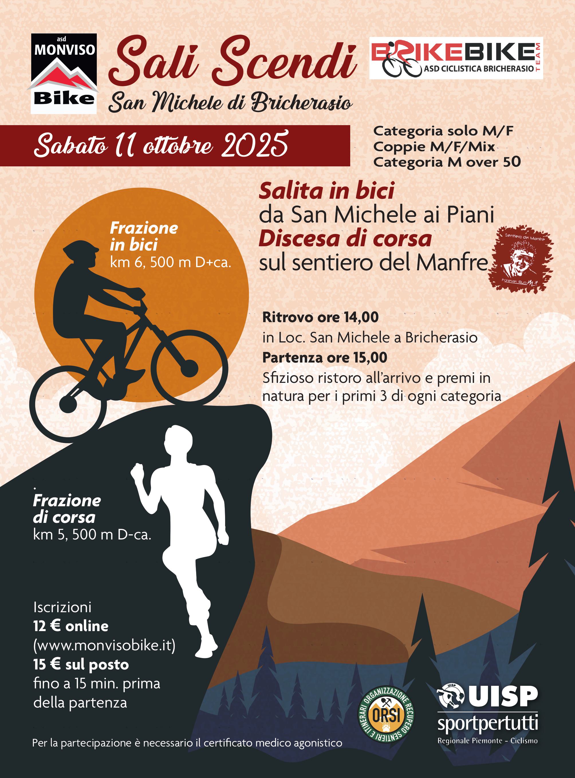 L'Associazione Sportiva Brike Bike, in collaborazione con il Monviso Bike, organizza per sabato 11 ottobre nella frazione di San Michele di Bricherasio la manifestazione Saliscendi, con la salita in bici, da San Michele ai Piani, e la discesa di corsa, lungo il sentiero del Manfre. La frazione in bici è lunga circa 6,5 km mentre quella a piedi è di circa 5,5 km e le iscrizioni si possono effettuare sia on line sul sito www.monvisobike.it a 12 € oppure sul posto fino a 15 minuti prima della partenza a 15 €. Il ritrovo è fissato alle ore 14 a San Michele con il via alla gara previsto per le 15. Le categorie ammesse sono: sono maschio e femmina, coppie maschi e femmine e miste e la categoria over 50 maschile.