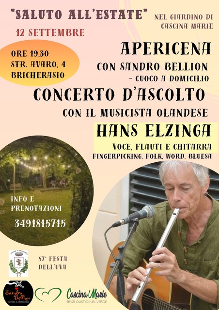 Venerdì 12 alle 19,30 aperIcena con Sandro Bellion ed il concerto di Hans Elzingh proposta da Cascina Marie nel proprio giardino, in Strada Avaro, 4 nella frazione di Cappella Merli.