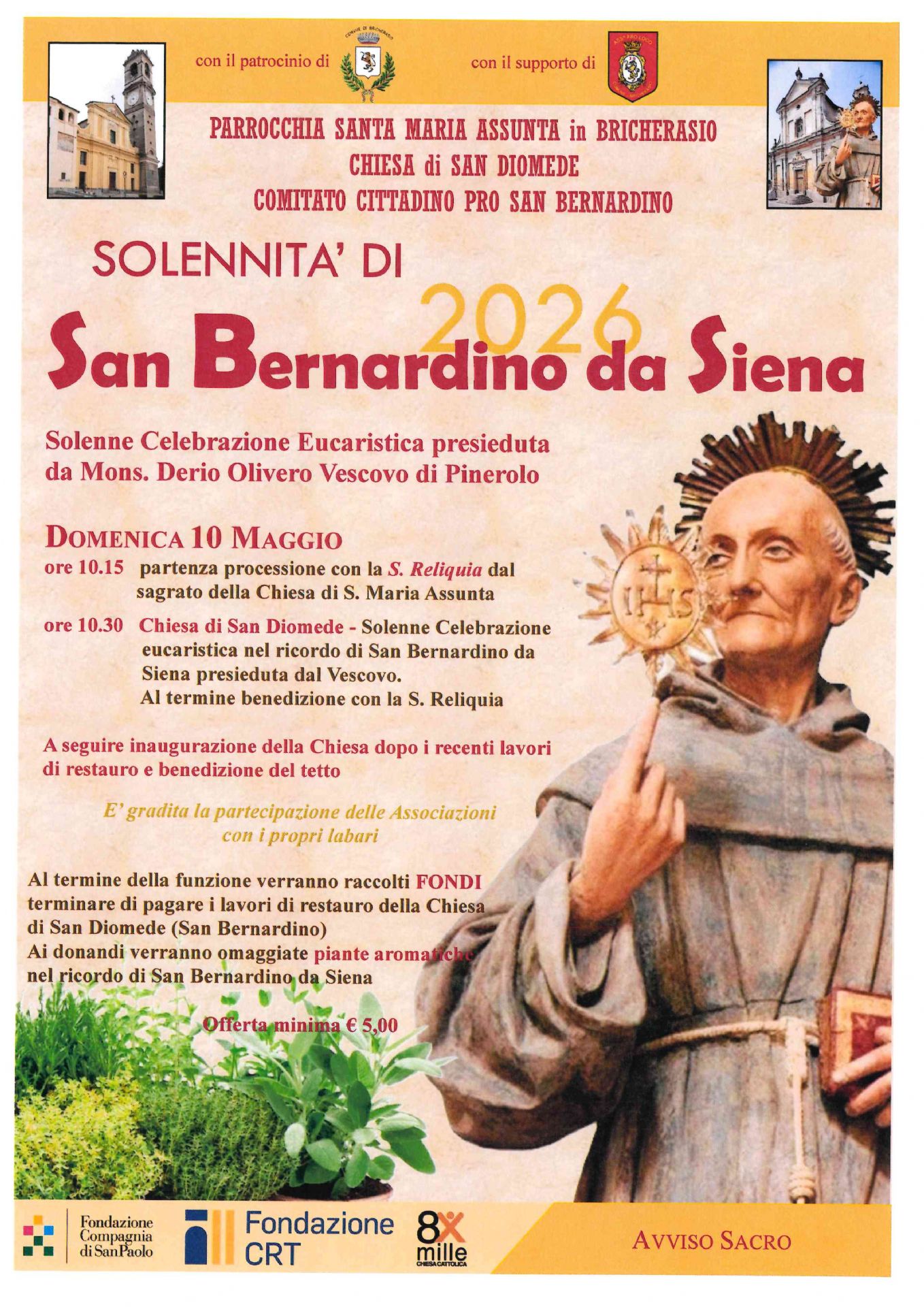 La Parrocchia Santa Maria Assunta ed il Comitato Cittadino Pro San Bernardino con il patrocinio del Comune di Bricherasio ed il sostegno della Pro Loco presentano la Solenne Celebrazione Eucaristica presieduta da Monsignor Derio Olivero, Vescovo di Pinerolo, in occasione della solennità di San Bernardino da Siena prevista domenica10 maggio. Il programma prevede alle ore 10,15 la partenza della processione con la Santa Reliquia dal sagrato della Chiesa di Santa Maria e alle 10,30 la S.Messa nel ricordo di San Bernardino presieduta dal Vescovo. Al termine la benedizione e l'inaugurazione della Chiesa dopo i recenti lavori di restauro della copertura.