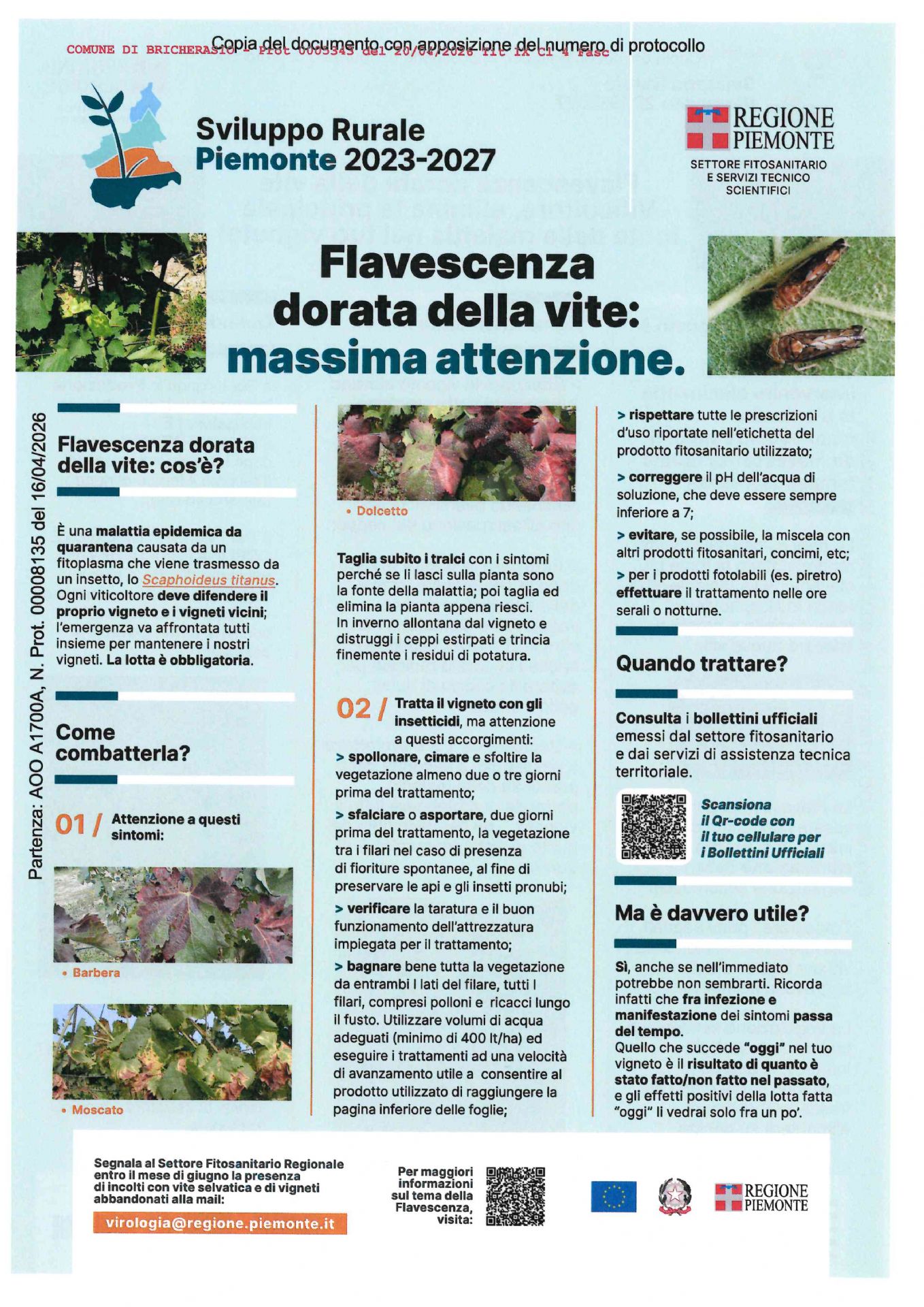 La Regione Piemonte condivide il seguente avviso relativo all'area di infestazione della flavescenza dorata della vite (di cui fa parte anche il territorio di Bricherasio):