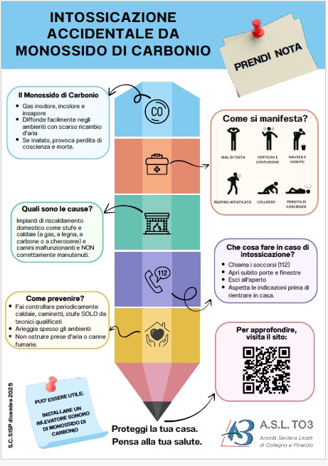 L'ASL TO3- dipartimento di prevenzione S.C. servizio igiene e sanità pubblica- (SISP) ha predisposto il materiale informativo per sensibilizzare la popolazione sul rischio dell'intossicazione accidentale da CO. Il SISP ha, infatti, sviluppato uno specifico progetto di prevenzione primaria, finalizzato a ridurre l'incidenza delle intossicazioni accidentali da monossido di carbonio attraverso il rafforzamento delle attività informative e di sensibilizzazione rivolte alla popolazione generale, ai professionisti sanitari del territorio e a tecnici addetti alla manutenzione degli impianti di riscaldamento.