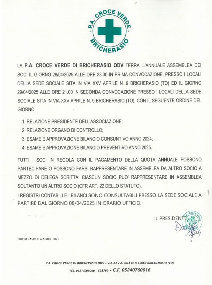 L’assemblea annuale dei soci della Croce Verde di Bricherasio è convocata per martedì 29 aprile alle ore 21 della sede in Via XXV Aprile, 9 per discutere sul seguente ordine del giorno: Relazione del Presidente dell’Associazione Danilo Mensa, Relazione dell‘Organo di controllo, esame ed approvazione dei bilanci consuntivo del 2024 e preventivo dell’anno in corso, chiudono varie ed eventuali. Tutti i soci in regola con il pagamento della quota annuale sono gentilmente invitati a partecipare e si ricorda che i registri contabili ed i bilanci sono già visionabili nella sede sociale a partire da martedì 8 aprile. I soci possono farsi rappresentare in assemblea tramite delega scritta. Si ricorda inoltre la facoltà di sostenere l’Associazione bricherasiese destinando il 5x1000 della dichiarazione dei redditi, utilizzando il codice fiscale 05240760016.