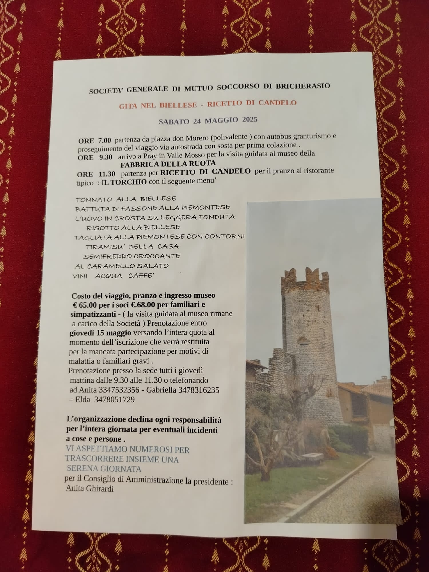 Il nuovo direttivo della Società di Mutuo Soccorso di Bricherasio organizza la gita sociale nel Biellese ed a Candelo per Sabato 24 maggio. Partenza dal Salone Polivalente di Piazza Don Morero a Bricherasio prevista per le ore 7 e sosta in autogrill per la colazione. L’inizio della visita guidata al Museo della fabbrica della ruota a Pray, in Valle Mosso, è previsto alle 9,30 e, la partenza con destinazione Ricetto di Candelo alle 11,30 per il pranzo al Ristorante “Il Torchio” e nel tardo pomeriggio il ritrovo per il ritorno a Bricherasio. Il costo del viaggio che comprende autobus, pranzo e ingresso al Museo è di 65 € per i soci e di 68 € per familiari e simpatizzanti. Prenotazioni fino ad esaurimento dei posti disponibili entro giovedì 15 maggio versando l’intera quota alla sede della Società bricherasiese, in Via Brignone 11/13, il giovedì mattina dalle ore 9,30 alle 11,30 oppure rivolgersi alla Presidente Anita Ghirardi al numero 3347532356, a Gabriella Pons al 3478316235 oppure Elda Rolfo al 3478051729.