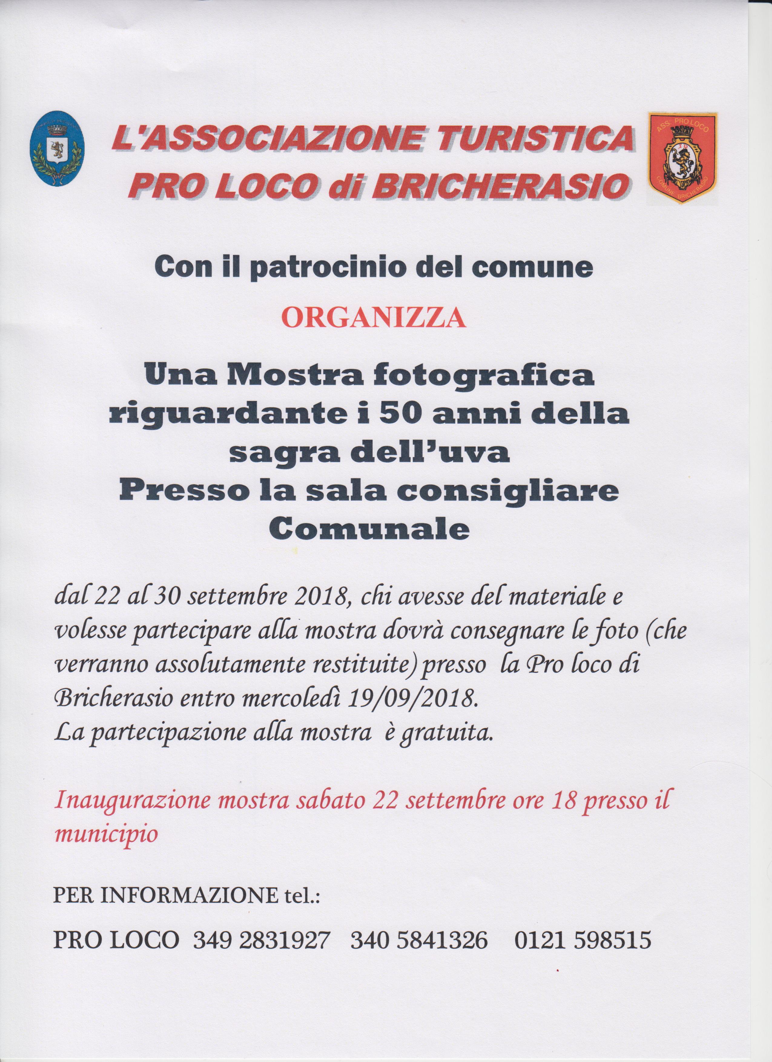 L'Associazione Pro Loco di Bricherasio con il patrocinio del comune organizza una Mostra fotografica riguardante i 50 anni della sagra dell’uva che si svolgerà nell’ambito della sagra dell’uva dal 22 al 30 settembre 2018. La partecipazione alla mostra e’ gratuita e chi avesse del materiale e volesse partecipare alla mostra dovrà consegnare le foto (che verranno assolutamente restituite) alla Pro loco di Bricherasio entro mercoledì 19 settembre. Inaugurazione mostra sabato 22 settembre ore 18 presso il municipio. Per informazioni rivolgersi alla Pro Loco ai mumeri 349/2831927, 340/5841326 e 0121/598515.