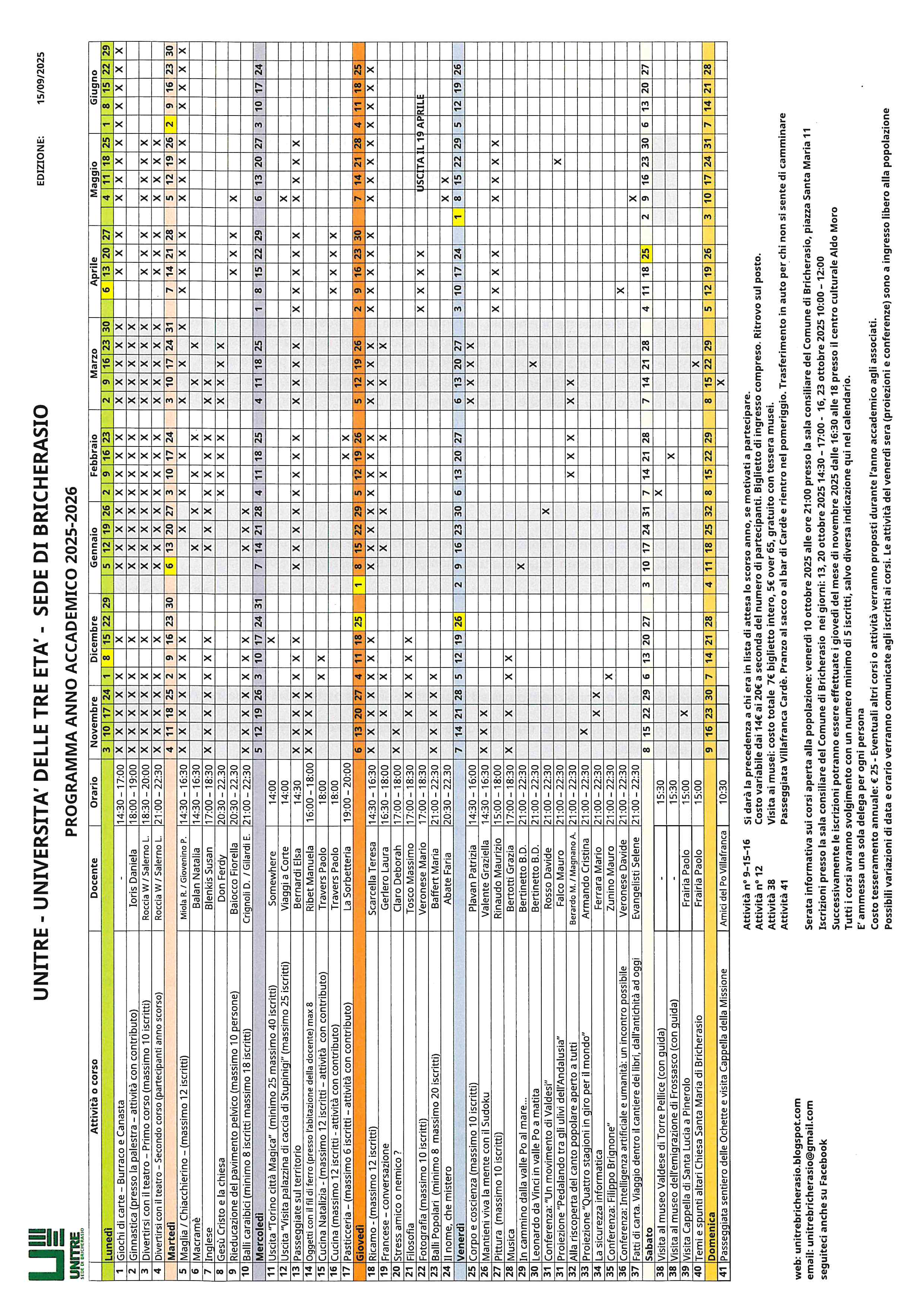 La presentazione dei corsi del 25^ anno accademico 2025/26 dell’Unitre di Bricherasio è prevista per venerdì 10 ottobre alle ore 21 nella sala Consiliare del Comune di Bricherasio, in Piazza Santa Maria 11 e le iscrizioni si effettuano nel medesimo luogo i lunedì 13 e 20 ottobre dalle ore 14,30 alle 17 e i giovedì 16 e 23 ottobre dalle ore 10 alle 12. Successivamente le iscrizioni potranno essere effettuate i giovedì del mese di novembre dalle 16,30 alle 18 al Centro Culturale “Aldo Moro” di Via Vittorio Emanuele II, 79/B dove si svolge gran parte dell’attività. Il costo del tesseramento annuale è invariato a € 25 ed eventuali altri corsi o attività verranno proposti durante l’anno accademico agli associati. Le attività del venerdì sera (proiezioni e conferenze) sono a ingresso libero alla popolazione e possibili variazioni di data e orario verranno comunicate agli iscritti ai corsi.