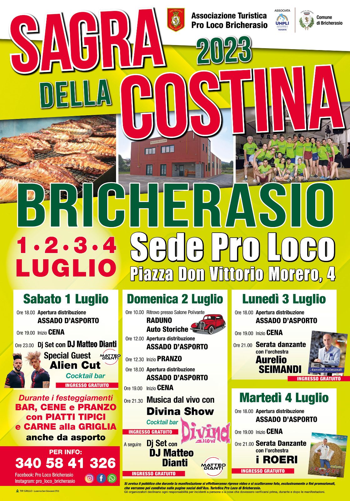 L’Associazione Turistica Pro Loco di Bricherasio organizza per sabato 1, domenica 2, lunedì 3 e martedì 4 luglio presso la sede di Piazza Vittorio Morero 4 la tradizionale “Sagra della costina”, giunta a quasi cinquanta edizioni e divenuta la manifestazione più importante dell’estate bricherasiese. Centinaia di persone coinvolte per quattro giornate, durante le quali si cuociono montagne di costine, patatine, agnolotti, antipasti vari, dolci, e alla sera quattro salti sul ballo a palchetto con rinomate orchestre ed eventi musicali per i più giovani.