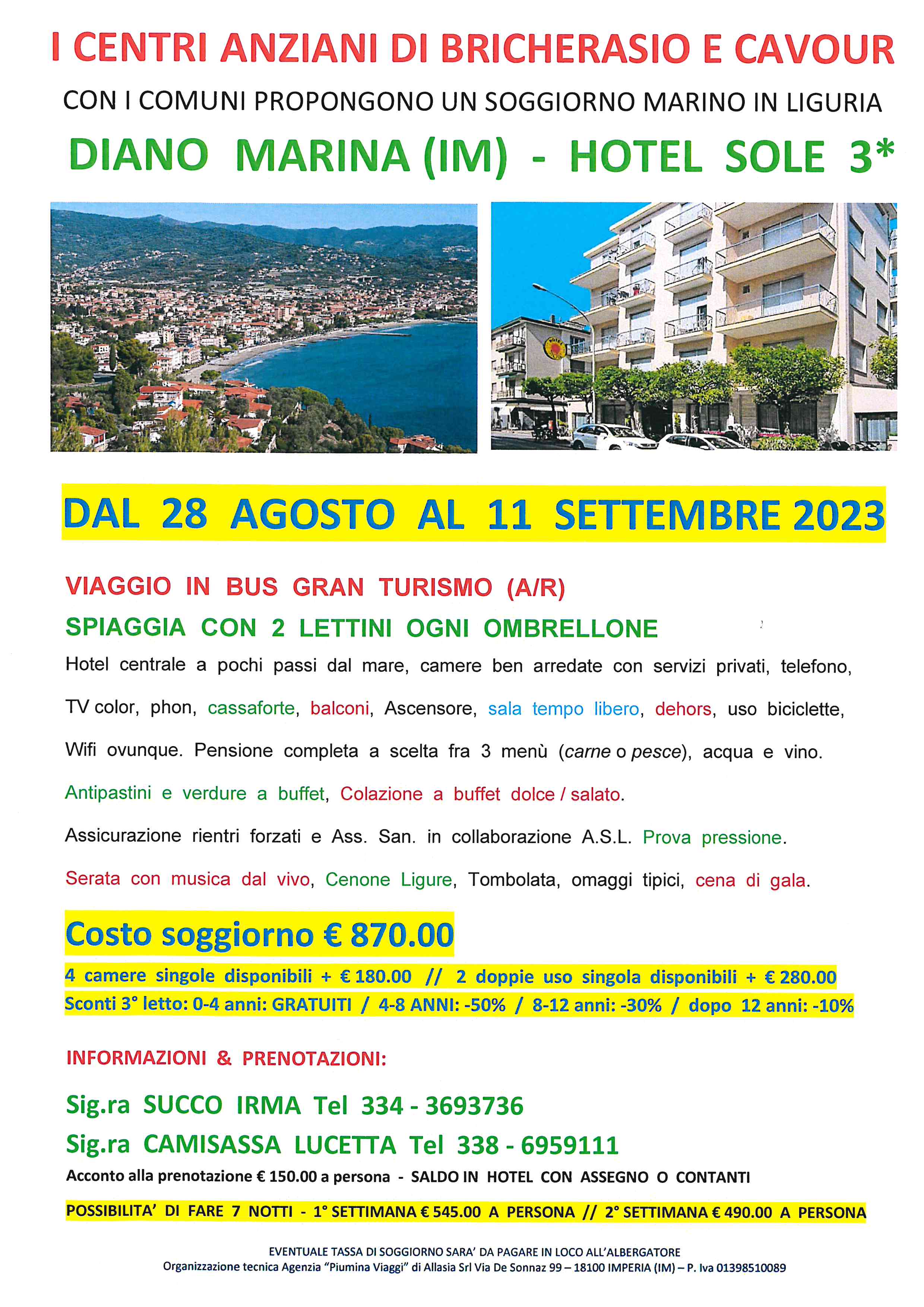 I Centri Anziani di Bricherasio e Cavour, con il patrocinio dei rispettivi Comuni, organizzano il consueto soggiorno marino a Diano Marina (Hotel Sole) da lunedì 28 agosto a lunedì 11 settembre. Soggiornare per due settimane nell’hotel vicinissimo al mare costa 870 €. L'acconto richiesto all'atto della prenotazione è di €150 a persona con la possibilità di fermarsi sette notti, la prima settimana a 545 € a persona mentre la seconda a 490 €. Il prezzo include il viaggio in autobus, pensione completa, spiaggia con ombrelloni e lettini, serate di musica dal vivo e tombolate con ricchi premi. Per maggiori informazioni sul soggiorno e prenotazioni telefonare al referente per il centro bricherasiese Irma Succo al numero 334/3693736 oppure a Lucetta Camisassa al 338/6959111.