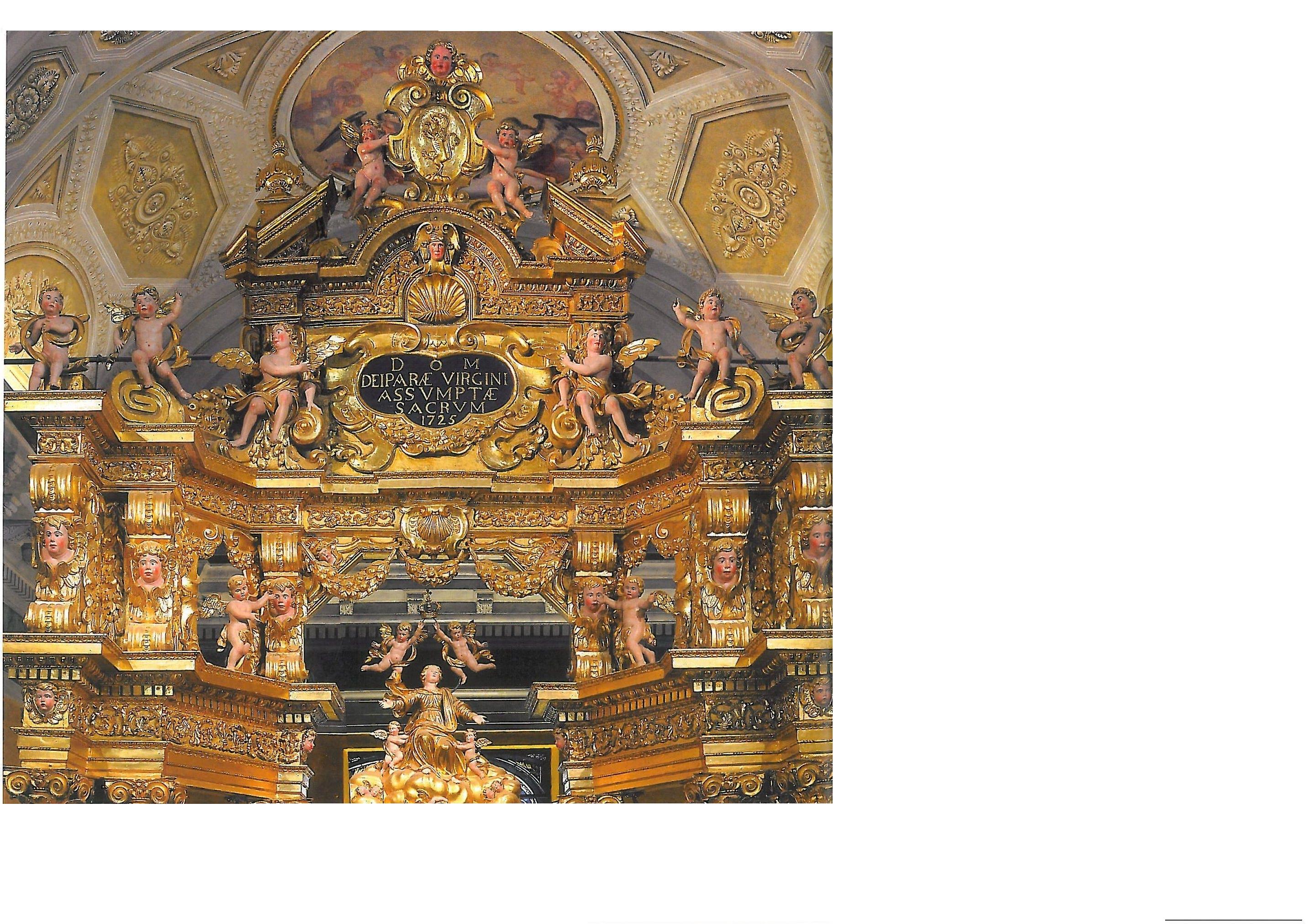 Sul basamento poggia un grande baldacchino esagonale a colonne tortili di grandi dimensioni, che ha ai fianchi le figure dei quattro evangelisti ed i loro simboli evangelici; le colonne del baldacchino sono istoriate con tralci e grappoli d'uva e sorreggono un architrave liscio che reca la dedica all'Assunta e lo stemma del comune.All'interno di questa solenne eppure aerea struttura sta il "Trionfo dell'Assunta", scultura che sormonta un altro baldacchino, questa volta ligneo, e rappresenta la Vergine in estasi coronata dagli angeli. L'intero complesso venne completato nel 1725 e rappresenta un vero e proprio capolavoro di scenografia barocca.