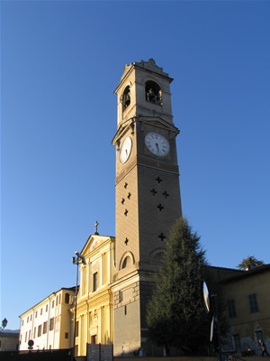 Il campanile che l'affianca risale al 1828 - 32 ed era in origine dotato di una cuspide in piombo rimossa nel 1860 e mai più sostituita per via dei danni causati dall'infissione di quattro bandiere tricolori.