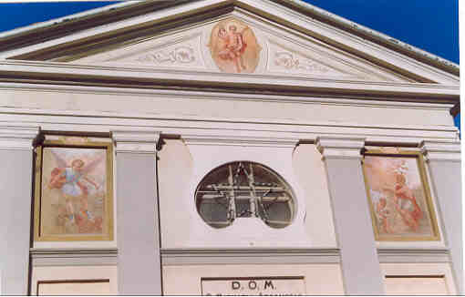 The facade is divided into five parts by pilasters framing the center of the entrance door and the overlooking lobed window, and on the sides, oval windows and two overlapping squares frescoes depicting St Michael and St John. The pilasters support a frame and pediment with a medallion with the Jesus Christ on cross image the bell tower is tripartite, decorated by a frame and features a clock and a bell cell.