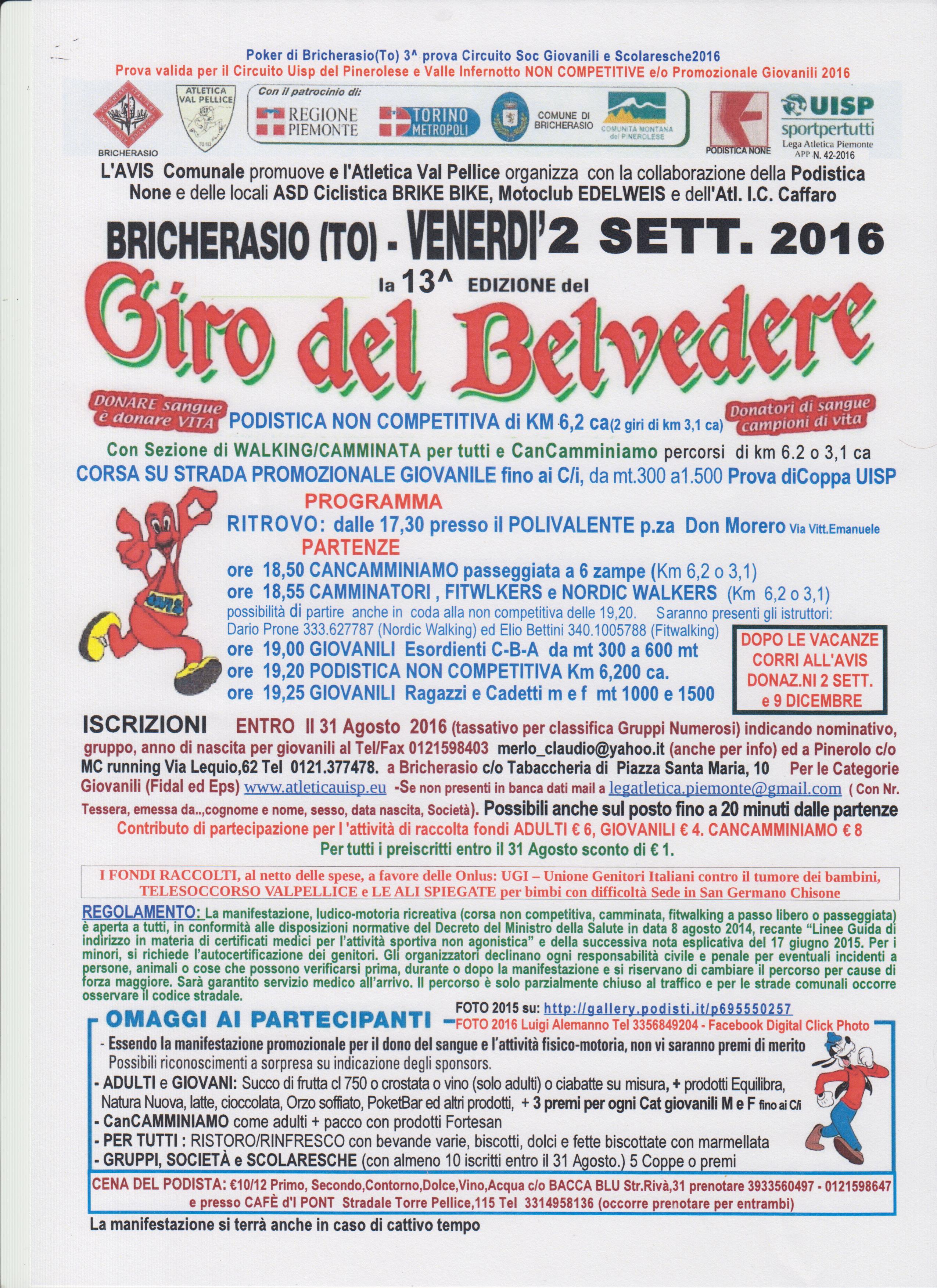 L’Avis di Bricherasio promuove e l’Atletica Val Pellice organizza, in collaborazione con la Podistica None e le locali associazioni Motoclub Edelweiss, Associazione Ciclistica Brike Bike, ORUAM, Associazione “Leonardo Sciascia” ed il gruppo atletica dell’Istituto Caffaro, per venerdì 2 settembre la tredicesima edizione del Giro podistico del Belvedere. La gara si presenta con qualche novità organizzativa, si conferma terza prova del poker di Bricherasio del circuito Società giovanili e scolaresche 2016 nonché prova sperimentale del circuito UISP del pinerolese e Valle Infernotto (non competitive e/o promozionali giovanili con premiazione finale non di merito ma di partecipazione dei relativi affiliati UISP). Viene confermato il percorso della precedente edizione che si è rivelato in grado di offrire emozioni podistiche ai numerosi partecipanti. Sarà allietata, anche quest’anno dalla presenza degli amici a quattro zampe che si cimenteranno nella CanCamminiamo così come è confermata la sezione Walking/camminata con percorrenze di 6,2 Km o 3,1 Km. L'iniziativa è anche parte del progetto “Cammina e corri con l’Avis“ avente come scopo la promozione della donazione del sangue e dell’attività motoria ludico-sportiva. Il tracciato inizia e termina al Centro Polivalente ed attraversa nei due sensi il centro storico per raccordarsi alla tradizionale parte che si snoda sulla Collina del Castello ove sorge la torretta del Belvedere caratterizzata da suggestivi passaggi panoramici e presenta brevi salite e discese toccando vigneti, frutteti ed il lavatoio coperto dell'800 ristrutturato di recente, fiancheggiando inoltre parte del canale comunale. Le iscrizioni si effettuano entro il 31 Agosto 2016 per classifica Gruppi numerosi indicando nominativo, gruppo, anno nascita per categorie giovanili indirizzando a: merlo_claudio@yahoo.it Tel/Fax 0121.598403, a Pinerolo al MC Running - Via Lequio, 62 Tel.0121.377478, oppure a Bricherasio (Tabaccheria di Piazza Santa Maria).