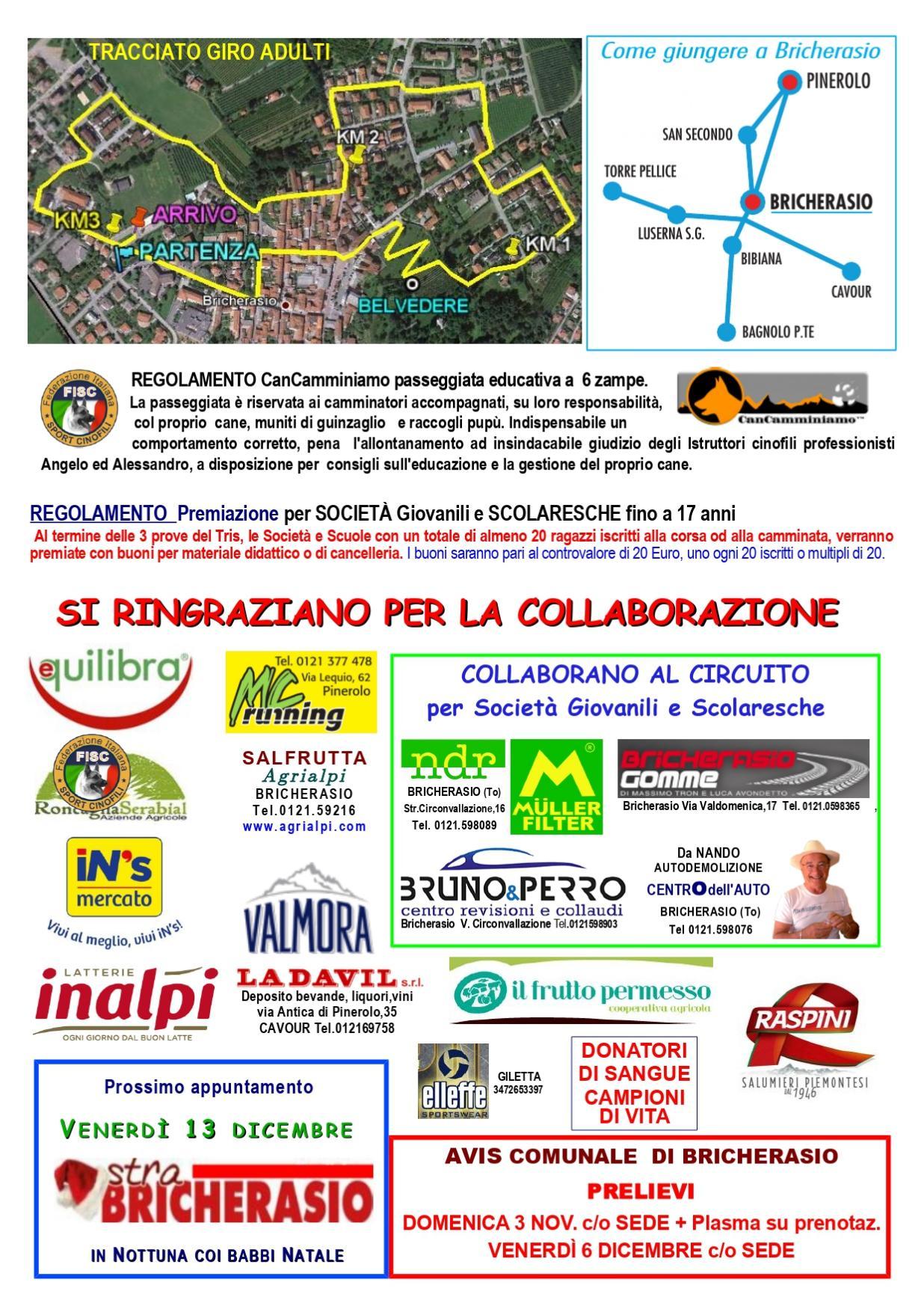 L’Avis di Bricherasio organizza con il supporto tecnico dell’Atletica Val Pellice in collaborazione con la Podistica None e le locali associazioni Motoclub Edelweiss, Ciclistica Brike Bike ed il gruppo atletica dell’Istituto Caffaro per la sera di venerdì 6 settembre la sedicesima edizione del "Giro podistico del Belvedere". La gara rientra nei festeggiamenti della 51^ Sagra dell’Uva bricherasiese con premiazione finale non di merito ma di partecipazione essendo una manifestazione ludico motoria ricreativa con gara non competitiva di circa 6,2 km e corsa su strada promozionale giovanile fino alla categoria allievi/e ricalcando gli indirizzi delle edizioni precedenti e viene inserita nel tris di Bricherasio come seconda prova del Circuito Società giovanili e scolaresche 2019 valida per il circuito UISP del Pinerolese e Valle Infernotto, non competitive e/o promozionali giovanili. Viene riproposto il suggestivo percorso disegnato per offrire speciali emozioni podistiche ai numerosi partecipantiSarà allietata, anche quest’anno dalla presenza degli amici a quattro zampe che si cimenteranno nella CanCamminiamo e dalla nutrita sezione Walking/camminata. Come da tradizione la manifestazione si propone di venire incontro alle sempre più variegate esigenze del mondo podistico con ben cinque prove pensate per le diverse categorie di podisti. Dopo il ritrovo delle ore 17,30 al Salone Polivalente di Piazza Don Morero le partenze a partire dalle 18,55 con i camminatori e Fitwalking e Nordic Walking, a seguire CanCamminiamo. Alle 19 inizio delle categorie Giovanili con le categorie Esordienti e Allievi. alle 19,20 parte la podistica non competitiva con dislivello totale in salita e discesa di 45 metri che attraversa nei due sensi il centro storico per raccordarsi alla tradizionale parte collinare ove sorge la torretta del Belvedere ed una Chiesa dedicata alla Madonna, caratterizzata da suggestivi scorci panoramici, presenta brevi salite e discese toccando vigneti, frutteti ed il lavatoio coperto dell'800 ristrutturato di recente fiancheggiando parte del canale comunale. Alle 19,25 il via alle restanti categorie giovanili. Le iscrizioni sono gradite per motivi organizzativi entro mercoledì 4 settembre (tassativo per gruppi numerosi) alla mail merlo_claudio@yahoo.it oppure al numero 370/1021341, indicando nome e cognome, gruppo o Soc. ed anno di nascita (il contributo di partecipazione si verserà sul posto alla conferma presso il tavolo Prescritti). Inoltre anche alla Tabaccheria Peirone di Piazza Santa Maria, 10 a Bricherasio e da MC running Via Lequio 62 a Pinerolo. Per le categorie giovanili fino agli Allievi e per gli adulti non competitivi tesserati su http://atltime.it/uisppiemonte.php ed è possibile iscriversi anche sul posto fino a 20 minuti dalle partenze (salvo chiusura anticipata). Ai partecipanti borsa omaggio con prodotti alimentari vari e ristoro merenda a buffet. Contributo di partecipazione richiesto per raccolta fondi è di € 6 per gli adulti, per le giovanili € 3. Dopo la gara cena del podista grazie alla convenzione con la Bacca Blu in Strada Rivà,31 (prenotazioni ed info telefonare allo 0121/598647 e 393/3560497) oppure Al Briche Risto Bar di Via Vittorio Emanuele II, 70 prenotazioni ed info al numero 393/3569345 (entrambi a 10/12 € cena e bevande). La manifestazione si terrà anche in caso di cattivo tempo.
