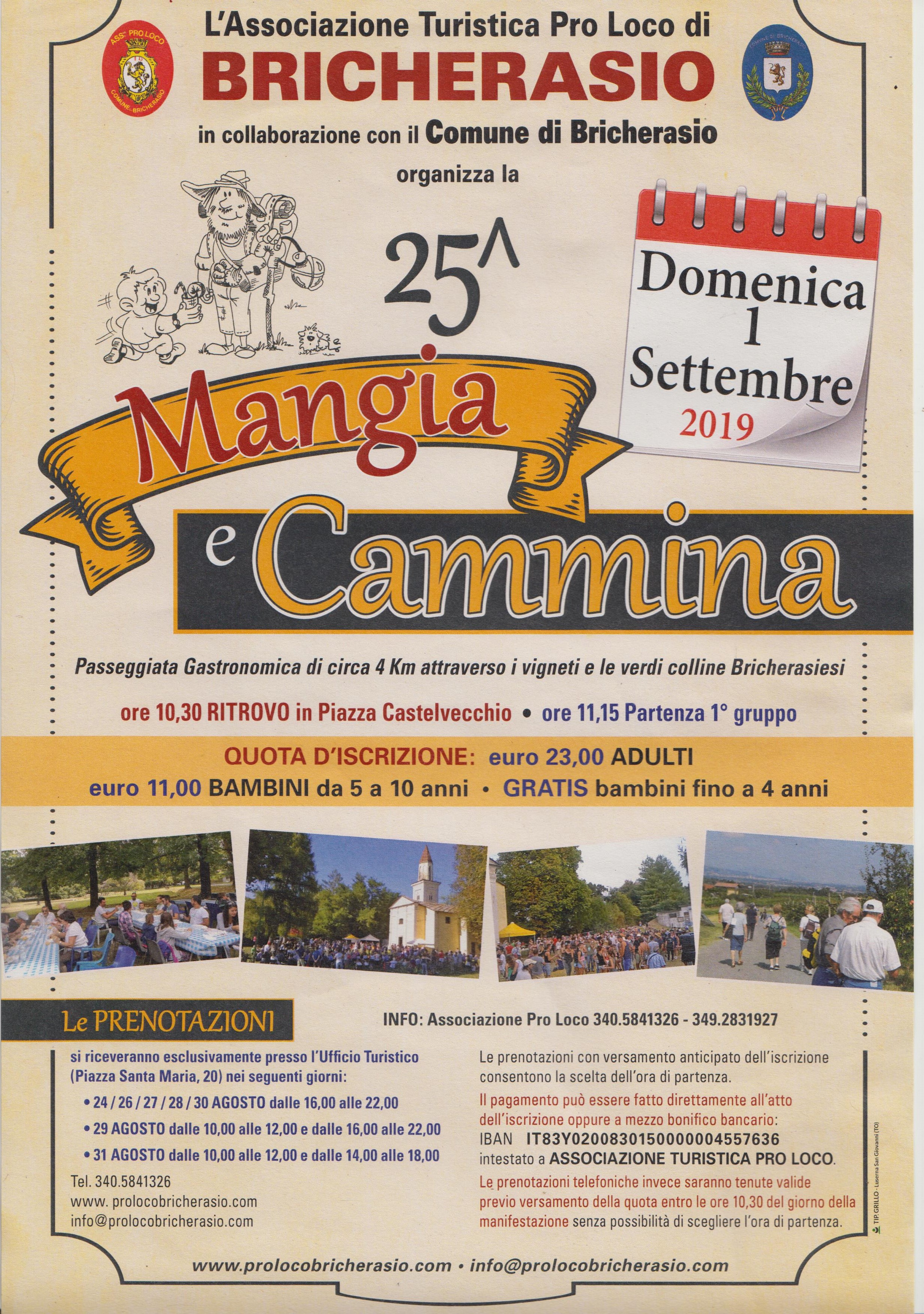 Nozze d’argento per l’appuntamento ormai classico a Bricherasio con la 25^ edizione della “Mangia e Cammina”, itinerario sulle colline del paese costellate di vigneti dove la musica e l'allegria fanno da cornice alla manifestazione, rientrante nel cartellone eventi della 51^ Sagra dell’Uva. La prima Domenica di settembre l’immancabile incontro, organizzato dalla Pro Loco in collaborazione con il Comune, con il via del primo gruppo alle ore 11.15, per gustare i sapori della buona tavola piemontese, assaporando i prodotti della terra bricherasiese e riscoprendo le tradizioni contadine, immersi nel verde ed a pieno contatto con la natura. La manifestazione è diventata un appuntamento fisso per gli amanti del divertimento in compagnia, con un numero di iscritti sempre in crescendo, tanto da superare i 1.300 nelle ultime edizioni. Sfruttando la posizione geografica del paese, che vede a due passi dal centro dolci colline ricoperte di vigneti colorati, si era pensato venticinque anni fa una manifestazione un po' diversa, per dare inizio ai festeggiamenti del settembre bricherasiese che fosse adatta alle famiglie, per far loro apprezzare i prodotti locali e per una giornata far dimenticare le ansie e lo stress della vita quotidiana. Tutta la macchina organizzativa è operativa e le prenotazioni si ricevono esclusivamente all’Ufficio turistico in Piazza Santa Maria n. 20 nei seguenti giorni: sabato 24, lunedì 26, martedì 27 mercoledì 28 e venerdì 30 agosto dalle ore 16 alle ore 22, giovedì 29 oltre all’orario pomeridiano anche la mattina dalle ore 10 alle 12 e sabato 31 agosto dalle 10 alle 12 e dalle 14 alle 18. Le prenotazioni con versamento anticipato dell’iscrizione consentono la scelta dell’ora di partenza. Il pagamento può essere fatto direttamente all’atto dell’iscrizione oppure tramite bonifico su IBAN IT 83 Y 02008 30150 000004557636 intestato all’Associazione Pro Turistica Pro Loco di Bricherasio. Le prenotazioni telefoniche invece saranno tenute valide previo versamento della quota entro le ore 10,30 del giorno della manifestazione senza possibilità di scegliere l’ora della partenza. La quota di partecipazione, invariata dall’anno scorso, è di 23 €, per i bambini dai 5 ai 10 anni si pagano 11 € e fino ai 4 anni l’iscrizione è gratuita. Ulteriori informazioni sul sito internet www.prolocobrichersio.com oppure telefonare al numero 340/5841326. L’ottima cucina si può gustare in sette comode tappe con una sana passeggiata in zone panoramiche, nel rodato percorso con arrivo sempre nel posto più suggestivo del paese: la Collina del Castello. La Pro Loco ringrazia i possessori dei terreni ed i commercianti che collaborano alla gestione delle diverse tappe. Si inizia con l'aperitivo proposto dalla Pro Loco e dal locale Al Briche Risto Bar e dall'Agrimacelleria da Giulia in piazza Molineris poi due postazioni con antipasti tipici: la prima, in collaborazione con la Macelleria Lisdero & Marras, nell’incantevole cornice del Parco di Villa Calleri di Sala, dove i partecipanti possono visitare i giardini della famiglia Cacherano di Bricherasio e la seconda, con il contributo della Macelleria Caffaratti, sotto l’Ala comunale. Nella tappa successiva si possono gustare degli ottimi agnolotti alla piemontese ed un minestrone casalingo in Strada Torretti, 39 nell’ampio parcheggio esterno dove c’era la Ditta Lorenzo Levetti (ora spostata in Strada Piemonte), proposti dalla Pro Loco. Prima della discesa ai Brandin postazione con il sorbetto della Gelateria “La Sorbetteria” mentre come secondo piatto la grande grigliata nel salone sede della Pro Loco e per finire dessert, frutta e caffè in collaborazione con l’Agriturismo “Bacca Blu” rallegrati da tanta musica con Yvonne Ramirez Acosta e Franco Falcetto, divertimento, e tanta allegria nel piazzale della Chiesa del Castello, il tutto innaffiato da vino ed acqua a volontà. Per terminare la giornata nei locale Al Briche Risto Bar in Via Vittorio Emanuele II, 70 spaghettata offerta a tutti i possessori del cartellino di partenza.