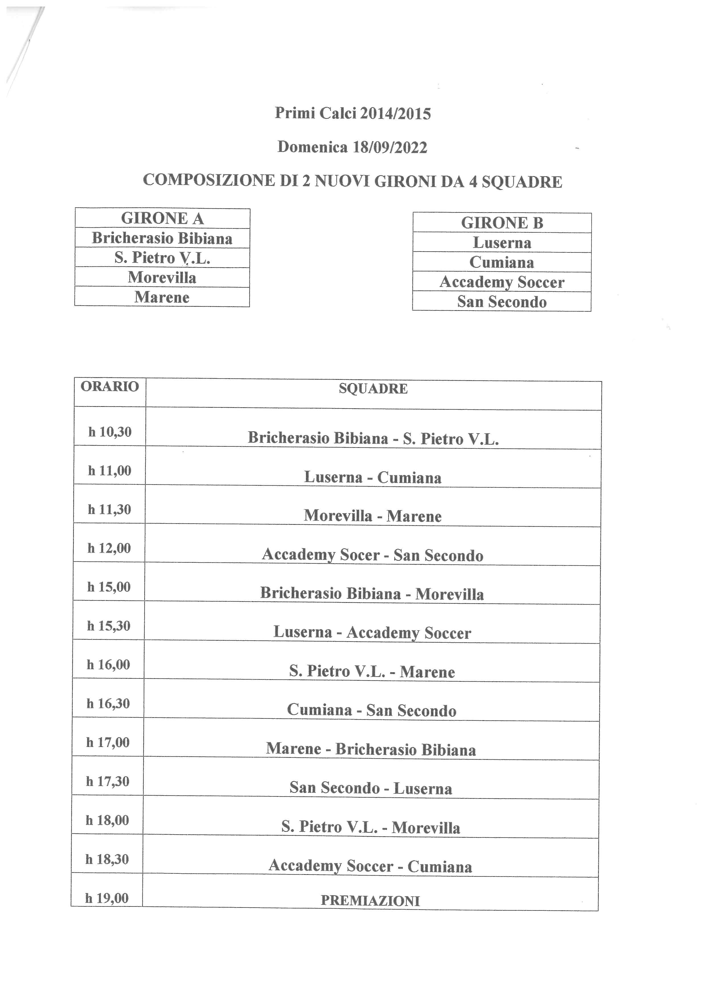 Anche il fine settimana del 17 e 18 settembre Bricherasio sarà invasa da piccoli calciatori e calciatrici che si contendono la la 31^ edizione del torneo giovanile Comune di Bricherasio organizzato dalla locale Associazione Bricherasio Bibiana nell’ambito della Sagra dell’Uva nelle categorie esordienti 2010 e Primi Calcio 2014/15. Diverse le modalità di svolgimento dei due tornei, i più piccoli si sfidano in due giorni da quattro squadre per contendersi il 10' Trofeo Cristal con la composizione dei nuovi gruppi già stabilita. Gli ospitanti del Bricherasio Bibiana con San Pietro Val Lemina, Morevilla, Marene, Luserna, Cumiana, San Secondo e Academy Soccer Piscinese Riva calpestano il sintetico degli impianti sportivi e disputano gli incontri a cinque giocatori. Le sette squadre partecipanti al 2^ Trofeo Alpistamp degli Esordienti dell’anno 2010 si battono in un unico girone all’italiana per stabilire la compagine vincitrice tra i padroni di casa del Bricherasio Bibiana, Infernotto, Piossasco, Chisone, San Secondo, Perosa e Scalenghe e disputano le partite a nove giocatori sul campo “ Calleri di Sala” lievemente ridotto ai limiti delle aree.