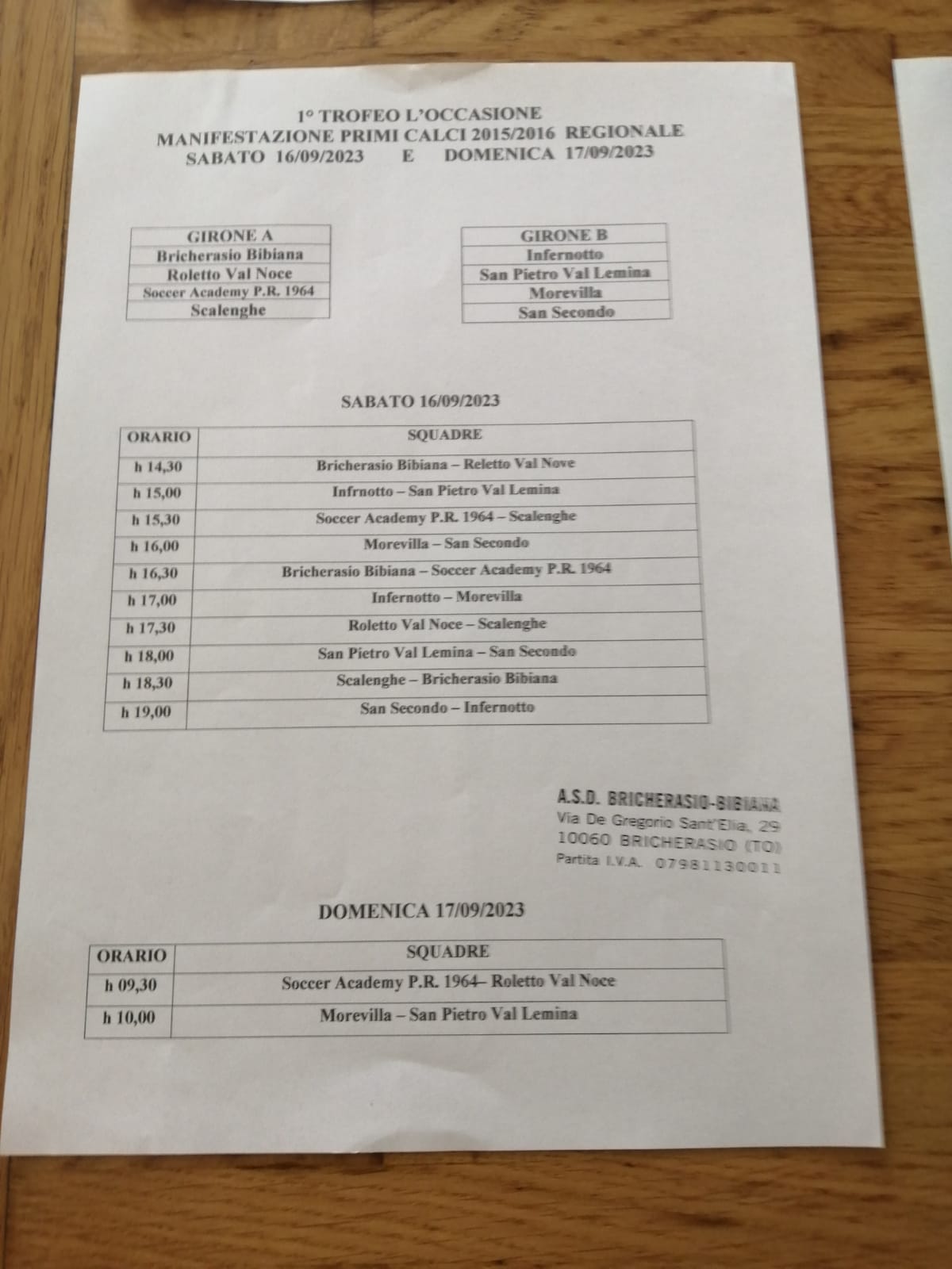 A Bricherasio agli inizi di settembre, da oltre trent'anni, si gioca il torneo giovanile di calcio "Comune di Bricherasio" apertura della nuova stagione organizzato dall'Asd Bricherasio Bibiana che richiama sempre sulle tribune gremite del "Calleri di Sala" centinaia di appassionati accompagnati da genitori, nonni e amici che colorano il tappeto verde con le divise sociali. Il torneo prosegue nel fine settimana del 16 e 17 con altre due categorie. Scendono sul terreno di gioco del "Calleri di Sala" gli Esordienti 2012 che disputano l'11 trrofeo Cristal dei padroni di casa del Bricherasio Bibiana, con Chisone, Marene e Perosa inseriti nel primo girone mentre nel girone B giocano Atletico Volvera, Infernotto, Olimpic Saluzzo e San Secondo e dopo una prima fase all'italiana le migliori due dei raggruppamenti disputano un ulteriore girone all'italiana per stabilire la vincente del trofeo. Anche le altre squadre continuano a gareggiare per la quinta posizione. La categoria Primi Calci 2015/16 a 5 giocatori calpesta l'adiacente campo in sintetico e si battono per il primo trofeo L'Occasione e nel girone A ci sono gli ospitanti del Bricherasio Bibiana con Roletto Val Noce, Scalenghe e Soccer Academy Piscinese. Le altre squadre inserite nel secondo girone sono Infernotto, Morevilla, San Pietro Val Lemina e San Secondo e la formula non cambia. Calcio d'inizio alle ore 14,30