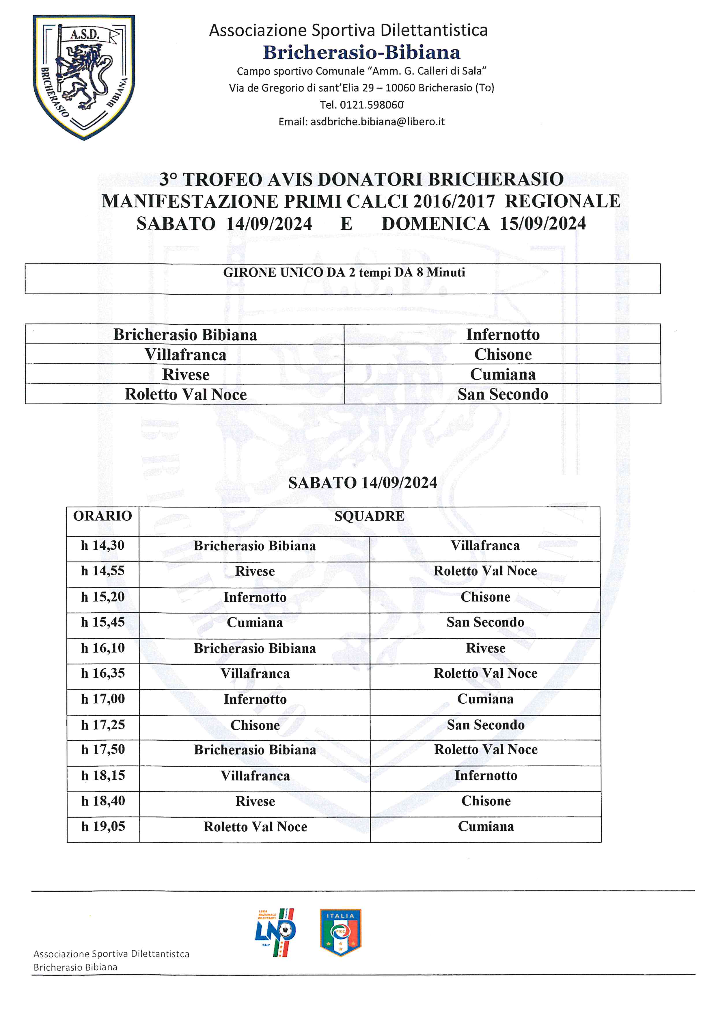 A Bricherasio agli inizi di settembre, da trentatre anni, si gioca il torneo giovanile di calcio “Comune di Bricherasio” apertura della nuova stagione organizzato dall'Asd Bricherasio Bibiana al "Calleri di Sala" che richiama centinaia di appassionati accompagnati da genitori, nonni e amici che colorano il tappeto verde con le divise sociali. Il torneo prosegue nel fine settimana del 14 e 15 con altre due categorie. Scendono sul rettangolo di gioco del “Calleri di Sala” gli Esordienti 2013 a 9 che disputano il 1º Trofeo Vet 24 le squadre del Bricherasio Bibiana con Roletto Val Noce, Luserna e Chisone raggruppate nel primo girone mentre nel girone B giocano Infernotto, San Secondo, Rivese e Villafranca e dopo una prima fase all’italiana le migliori due dei raggruppamenti disputano un ulteriore girone all’italiana per stabilire la vincente del trofeo. Anche le altre squadre continuano a gareggiare per la quinta posizione. La categoria Primi Calci 2016/17 a 5 giocatori calpesta l’adiacente campo in sintetico e si batte per il 3º Trofeo Donatori Avis di Bricherasio e nel girone A ci sono Roletto Val Noce, Villafranca, Rivese e gli ospitanti del Bricherasio Bibiana. Le altre squadre inserite nel secondo girone sono Infernotto, Chisone, Cumiana e San Secondo e la formula non cambia. Calcio d’inizio alle ore 14,30.