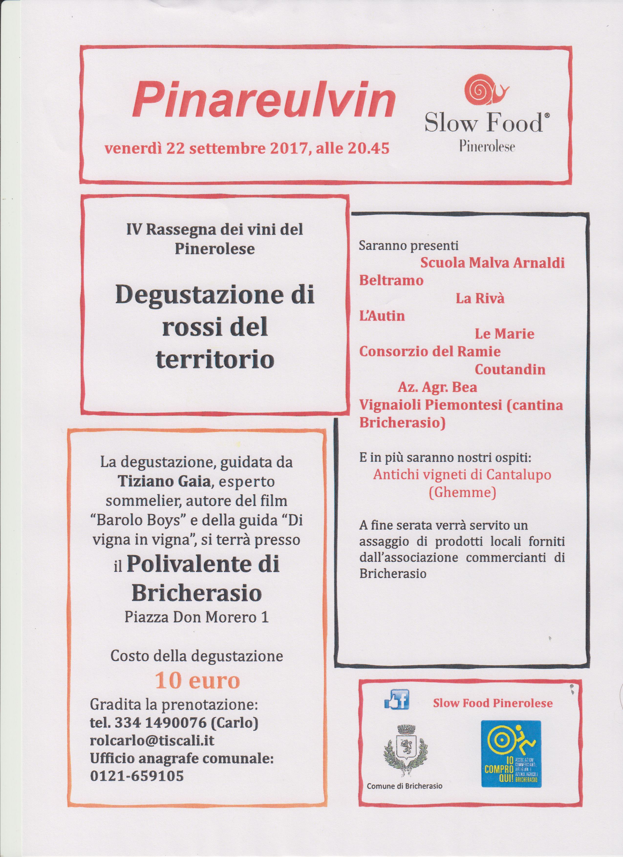 Venerdì 22 settembre, ore 20.45, al Salone Polivalente si terrà la 4° rassegna "Pinareulvin" dei vini DOC pinerolesi, organizzata dal Comune e da Slowfood pinerolese. Anche quest'anno la degustazione avrà una guida d'eccezione: Tiziano Gaia, già autore della guida "Di vigna in vigna" e del film "Barolo boys", oltre che esponente di punta di Slowine. I rossi delle aziende pinerolesi: La Rivà, Vignaioli Piemontesi (Cantina Sociale di Bricherasio), Coutandin, Azienda agricola Bea, Le Marie, Vini Beltramo, L'Autin, Consorzio del Ramie di Pomaretto, Scuola Malva Arnaldi saranno accompagnati dai prodotti locali e dai vini dei produttori ospiti (Antichi Vigneti di Cantalupo di Ghemme - Novara). L'evento rientra nelle manifestazioni della 49^ edizione della Sagra dell'Uva. Costo: 10 €. Prenotazioni fino ad esaurimento posti presso l'ufficio anagrafe comunale (0121-59105) o all'indirizzo rolcarlo@tiscali.it o al n° 334-1490076.