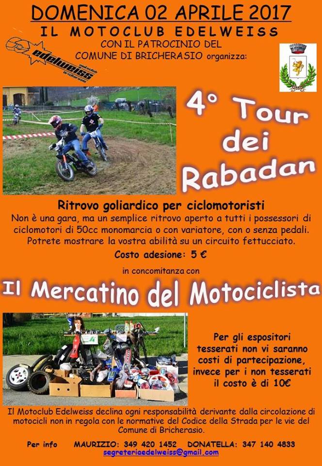 Il Motoclub Edelweiss di Bricherasio, con il patrocinio del Comune di Bricherasio, organizza per Domenica 2 aprile il quarto ritrovo "Tour dei Rabadan", appuntamento goliardico per appassionati di gite in ciclomotore su asfalto o sterrato con ciclomotori da 50 cc monomarcia o con variatore da gara, con o senza pedali per mostrare l’abilità su un circuito fettucciato. Il tour non è una gara, né prevede classifiche; le uniche regole riguardano il rispetto altrui e del codice della strada: ogni partecipante sarà responsabile di se stesso, anche nel caso di organizzazione di giri in autonomia sul territorio. Il Motoclub declina ogni responsabilità derivante dalla circolazione di motocicli non in regola con le normative della strada per le vie di Bricherasio. Insieme all’iniziativa, si svolge l’ottava edizione del “Mercatino del motociclista”, una mostra-scambio per privati e commercianti di materiale motociclistico con esposizione libera e gratuita. L’evento si svolgerà al coperto e all’esterno del Salone Polivalente di Piazza Don Morero a Bricherasio, dove ogni appassionato potrà esporre e scambiare il proprio surplus di materiale motociclistico come abbigliamento, materiale sportivo, moto e scooter d’epoca e non, caschi, guanti, calzature, accessori, manuali di officina, stampe, libri e riviste del settore. Tutto ciò che non serve più a qualcuno, può risultare utile ad altri. L’esposizione dei prodotti, ad ingresso gratuito, comincerà alle ore 9,00 e terminerà alle 18,30. Per aderire alla manifestazione, si deve utilizzare, fino ad esaurimento posti, il sito internet all’indirizzo segreteriaedelweiss@gmail.com, indicando le proprie generalità e recapiti. Va tenuto presente che, per poter esporre all’interno del Salone Polivalente, bisogna prenotare tempestivamente. Per gli espositori tesserati al Motoclub Edelweiss non vi saranno costi di partecipazione, per gli altri il costo è di 10 €. Informazioni da Maurizio al 349/4201452 oppure Donatella al numero 347/1404833. Si ricorda, inoltre, che gli organizzatori non forniscono attrezzature e gazebo, e non si ritengono responsabili nelle transazioni o per eventuali contestazioni.