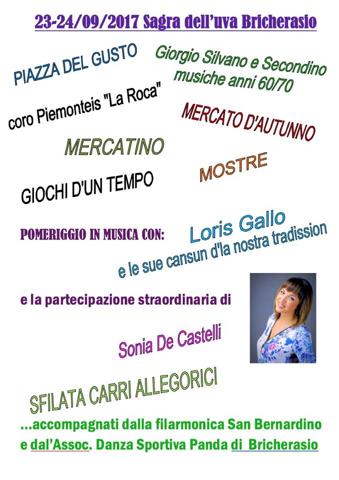 Dal 2 al 30 settembre 2017 Bricherasio è di nuovo in festa per la 49° edizione della Sagra dell'Uva, che vedrà il suo culmine nel weekend 23-24 settembre con la tradizionale sfilata dei carri allegorici, il Gran Mercato d'Autunno e la riproposizione della "Piazza del Gusto", con la Piazza Castelvecchio che ospiterà gli stand dei produttori vinicoli della DOC Pinerolese e darà la possibilità di gustare con servizio di ristorazione a self-service i piatti della tradizione a cura dei produttori agroalimentari e dei commercianti locali.
