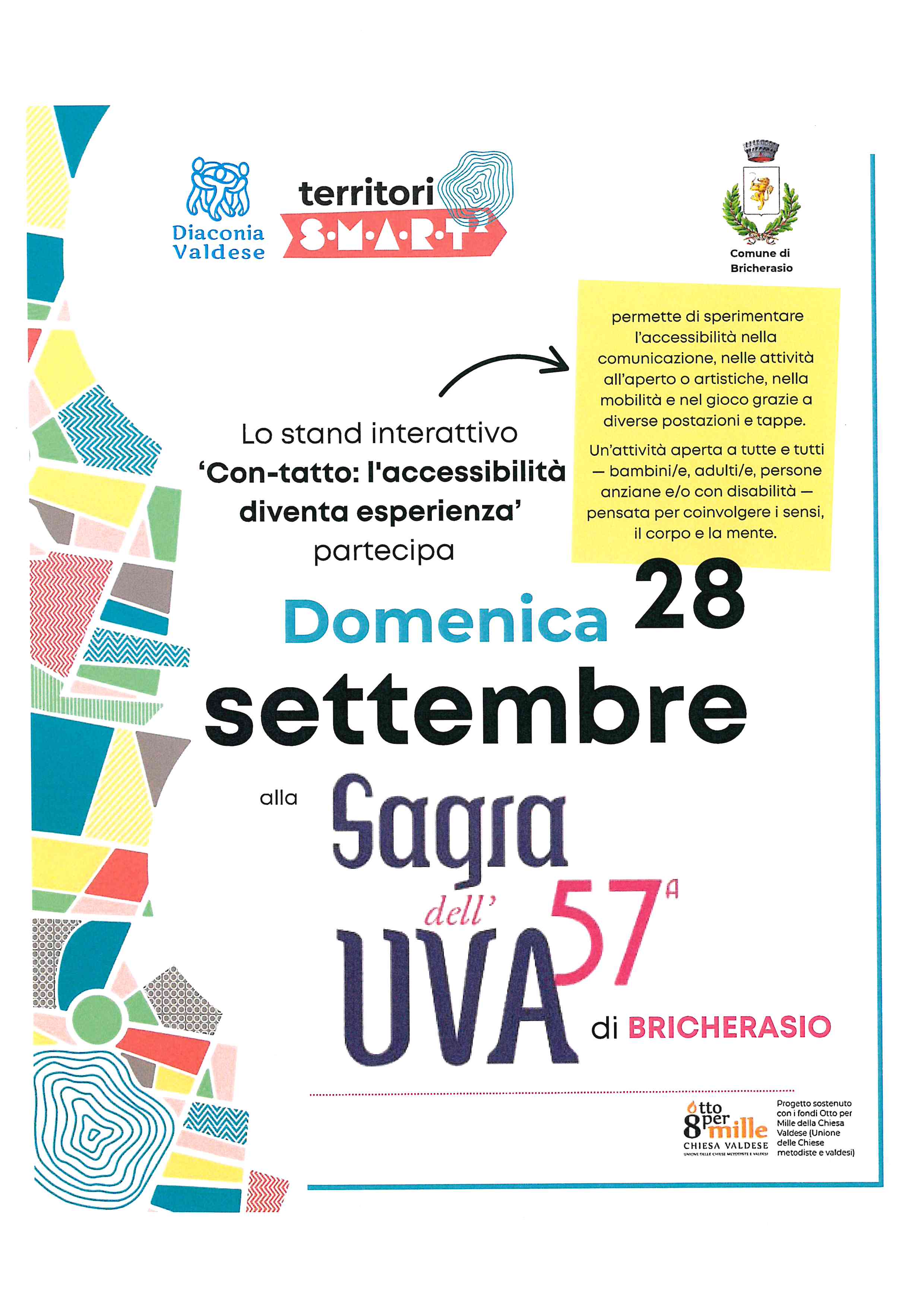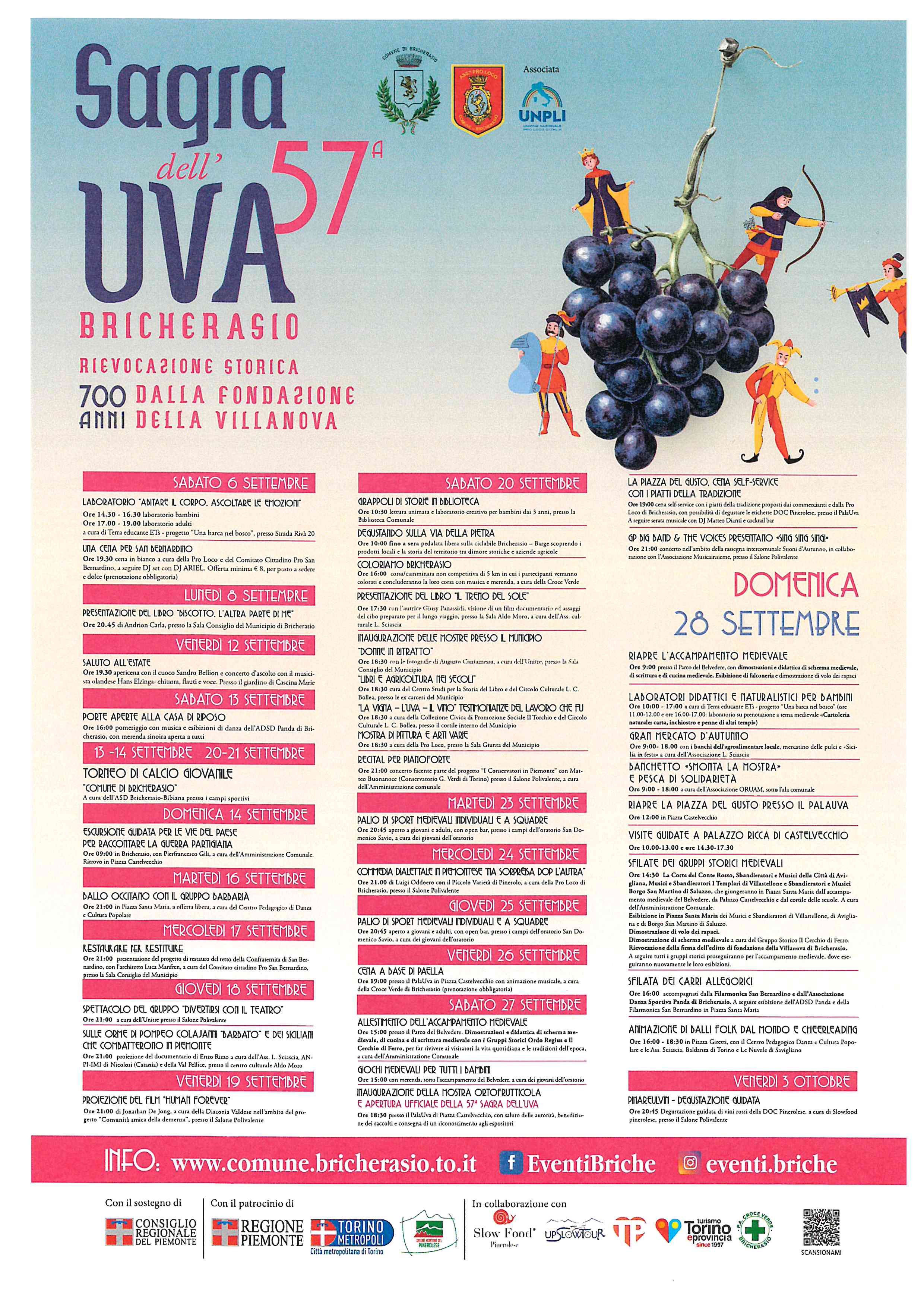 La Sagra dell'Uva di Bricherasio, nel più ampio contesto del "Settembre Bricherasiese" giunge nel 2025 alla sua 57° edizione. Al consueto ricco programma di eventi culturali, enogastronomici, musicali e sportivi si aggiunge quest'anno il ricordo dei 700 anni dalla fondazione della "Villanova" di Bricherasio, ovvero l'edificazione del nuovo abitato medievale, nella sede attuale, su iniziativa del principe Filippo d'Acaia. Gruppi, esibizioni, giochi e rievocazioni storiche a tema medievale arricchiranno così il lungo mese di settembre, da sempre dedicato alla festa per i prodotti della terra e per la vendemmia. Qui di seguito il programma completo, in graduale aggiornamento, e lelocandine specifiche dei vari eventi previsti.