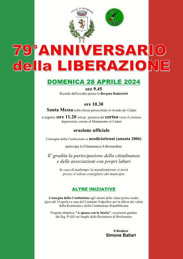 In occasione del 79º Anniversario della Liberazione, il Comune di Bricherasio organizza per Domenica 28 aprile la cerimonia ufficiale in memoria dei caduti. Alle ore 9.45 il ricordo dell’eccidio alla Borgata Badariotti, alle 10.30 la Santa Messa nella chiesa parrocchiale di Santa Maria cui seguirà la partenza del corteo ufficiale (ore 11.20 circa) verso il cimitero per la deposizione delle corone al Monumento ai Caduti e l'oraizone ufficiale, con la partecipazione della Filarmonica San Bernardino. Nel salone consilaire vi sarà la consegna della Costituzione ai diciottenni (nati nel 2006). Gradita la partecipazione della cittadinanza e delle associazioni con propri labari e in caso di maltempo la manifestazione si svolgerà nel salone consiliare del municipio bricherasiese.