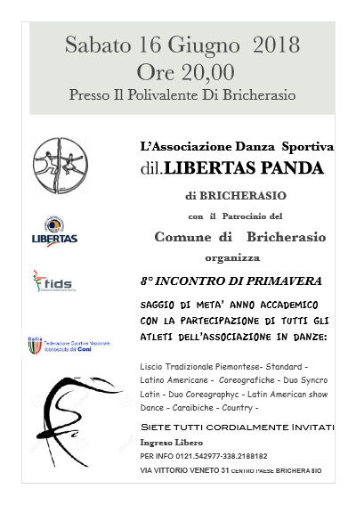 L’Associazione Danza Sportiva Dilettantistica Libertas Panda di Bricherasio con il patrocinio del Comune organizza per le ore 20 di sabato 16 giugno l'8° incontro di primavera al Salone Polivalente di Piazza Don Morero a Bricherasio. Il saggio di metà anno accademico prevede la partecipazione di tutti gli atleti del Panda che si esibiscono in danza Liscio tradizionale piemontese, Standard, danze Latino Americane, Coreografiche e Caraibiche, duo Syncro Latin, duo Coreographyc, Latin American show Dance Country. La serata è ad ingresso libero. Per maggiori informazioni chiamare lo 0121/542977 o il 338/2188182.
