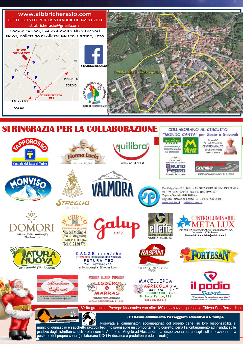La Squadra AIB e Protezione civile di Bricherasio promuove e l’Atletica Val Pellice organizza in collaborazione con la Podistica None le locali associazioni Avis, Motoclub Edelweiss e Volontari Comunali per venerdì 16 dicembre la nona edizione della StraBricherasio, terzo memorial Andrea Caffaratti, ultima prova del poker podistico bricherasiese. La manifestazione regionale di corsa su strada giovanile è una podistica notturna con Babbo Natale, non competitiva con sezioni di Fitwalking, Nordic Walking, camminata a passo libero libera a tutti e terza edizione della Can Camminiamo, passeggiata educativa a 6 zampe per le vie illuminate di Bricherasio. La camminata con i cani è riservata ai camminatori accompagnati col proprio cane, muniti di guinzaglio e raccogli pupù ed è indispensabile un comportamento corretto pena l’allontanamento ad insindacabile giudizio di due istruttori cinofili professionisti. Il cuore pulsante della corsa lascia la suggestiva e centrale Piazza Santa Maria per trasferirsi al Salone Polivalente di Piazza Don Morero che diventa il punto di partenza ed arrivo di tutte le categorie podistiche in programma. Il maxi ristoro si tiene all’esterno dell’edificio con la novità di qualche chilo di nutella e la conferma, come da tradizione, della salsiccia alla brace. Il ritrovo per le iscrizioni è alle ore 18,00 al Salone Polivalente di Piazza Don Morero a Bricherasio, la partenza dei bambini per una mini corsa o giochi con istruttori alle ore 19,00. I camminatori e i walkers partono alle 19,20 a cui segue la passeggiata con istruttori cinofili e le giovanili alle 19,30. Alle 20,20 la podistica non competitiva di 6 km. Per iscrizioni fino a mercoledì 14 dicembre scrivere a merlo_claudio@yahoo.it o recarsi al Podio Sport in Via Bogliette, 3/C a Pinerolo segnalando nominativo, tipo di gara, società o gruppo di appartenenza ed anno di nascita per le giovanili e si può aderire sul posto fino a 15 minuti prima della partenza. Parte del ricavato andrà alla Fondazione F.O.R.M.A. per il progetto “Urologia Infantile” ed il restante alla squadra AIB di Bricherasio da destinare alla salvaguardia del territorio. Essendo la manifestazione indetta per promuovere la cultura ecologica, il rispetto per l’ambiente e l’attività ludico motoria non sono previsti premi di merito ma a tutti i partecipanti sarà consegnato un pacco gara con generi alimentari oltre al ristoro all’arrivo con bevande calde e fredde, panini con salsiccia alla brace, biscotti, panettoni e vin brulè. Dopo la gara cena o pizza del podista al Ristorante-Pizzeria “Il Pirata”, alla Pizzeria “Al Cartoccio” e l’Agriturismo “La Bacca Blu“.La manifestazione rientra nella diciottesima edizione del Natale bricherasiese.