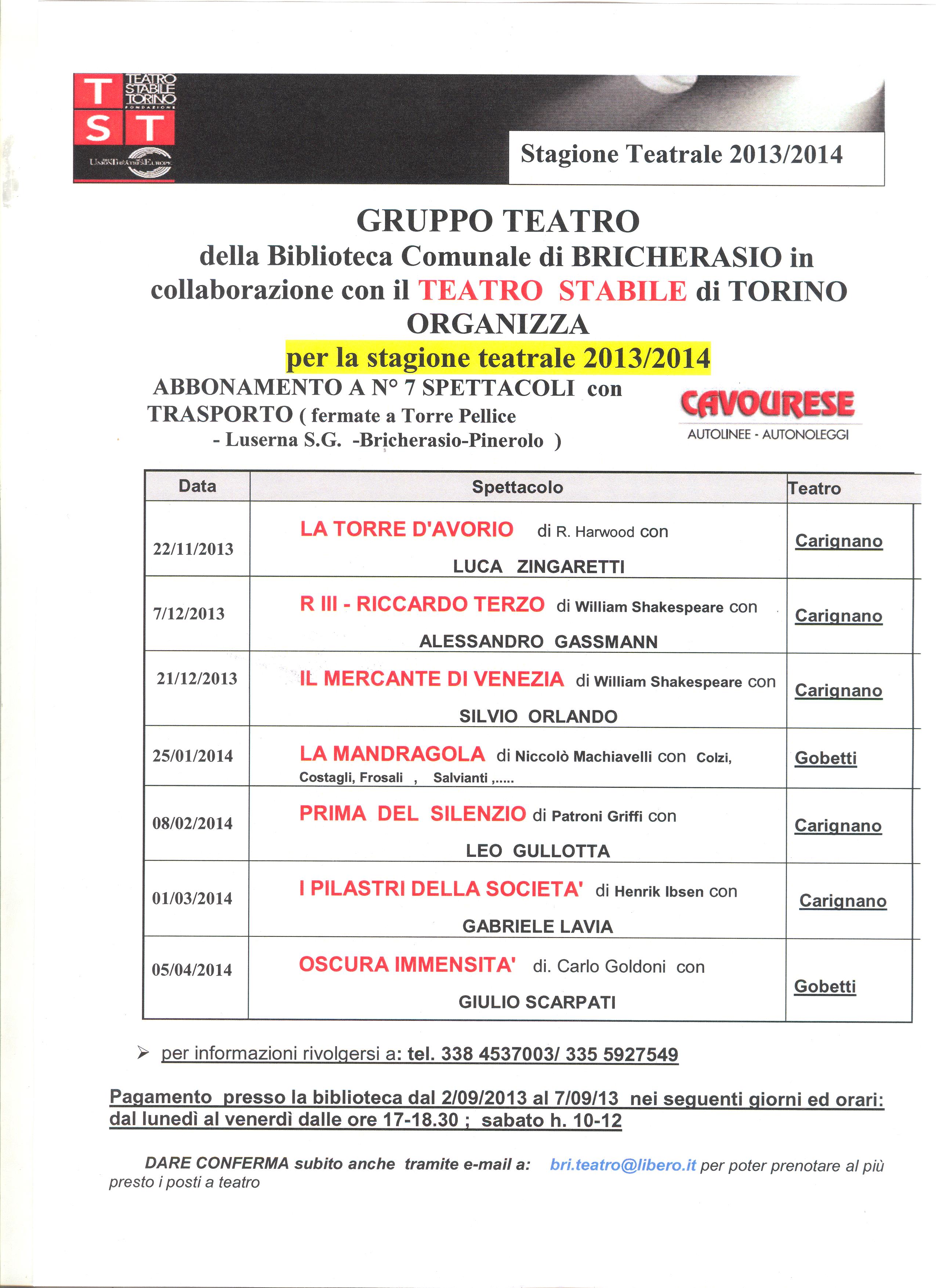 ll Gruppo Teatro della Biblioteca comunale di Bricherasio, in collaborazione con il Teatro Stabile di Torino, organizza per la stagione teatrale 2013-14 un abbonamento a 7 spettacoli
