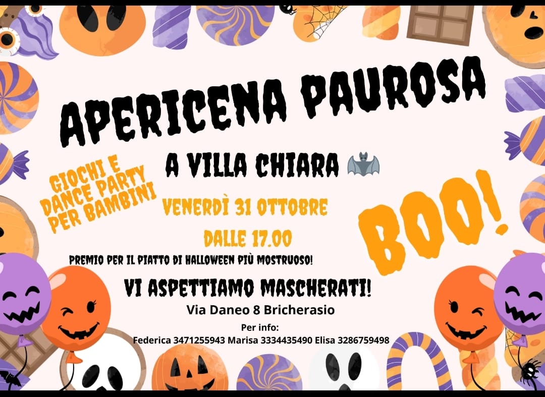 Venerdì 31 ottobre dalle ore 17 al Centro Villa Chiara di Via Daneo 8 a Bricherasio si organizza, in occasione della serata di Halloween, l’evento “Apericena paurosa” con giochi e dance party per bambini. Premio per il piatto più mostruoso, si raccomanda di partecipare mascherati. Per maggiori informazioni rivolgersi a Federica al 347 1255943, a Marisa al 333 4435490 oppure ad Elisa al numero 328 6759498.