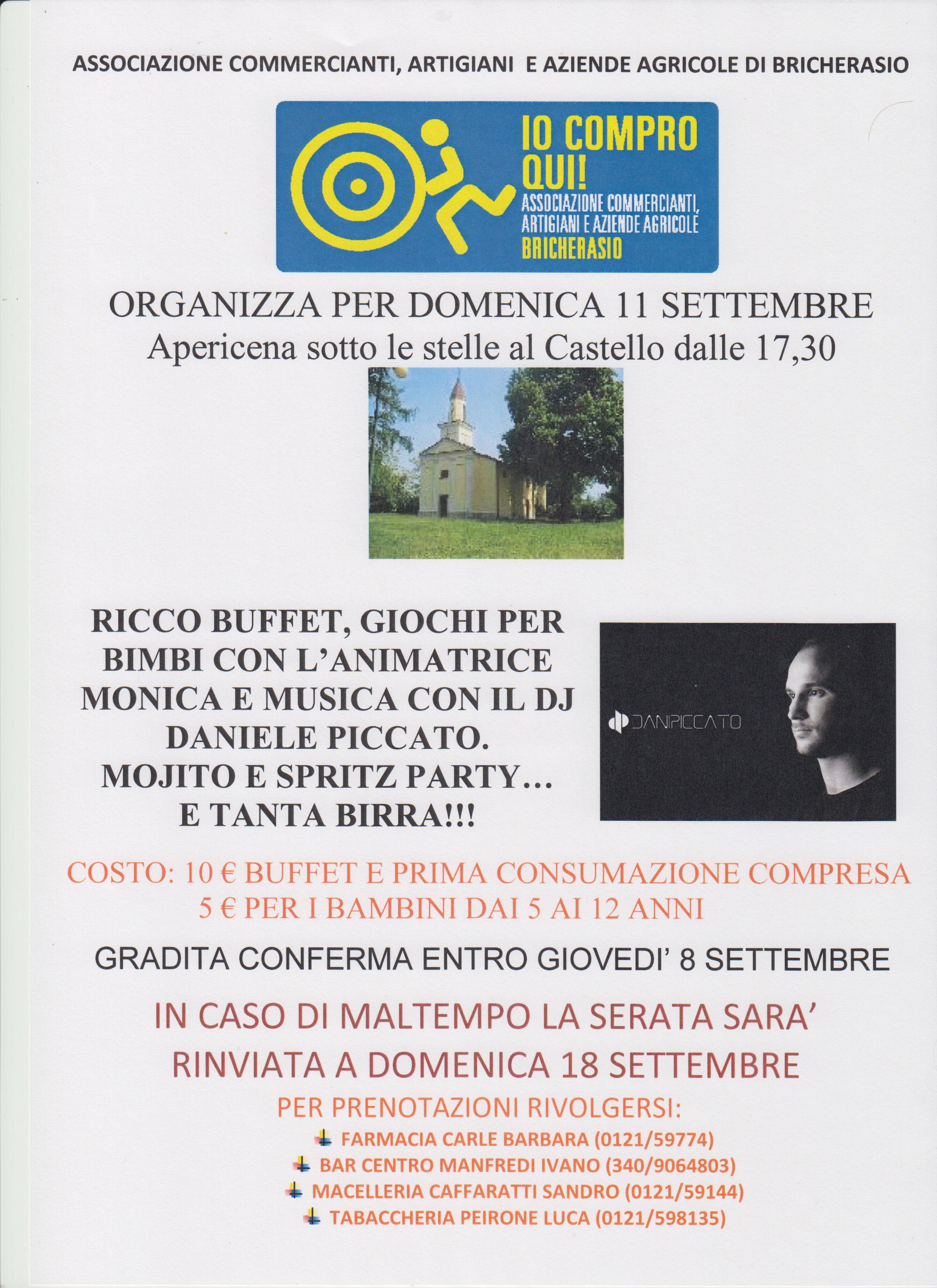 Un'apericena sotto le stelle, questa è il nuovo evento promosso dell'Associazione Commercianti, Artigiani e Aziende Agricole di Bricherasio, inserito nel contesto della 48^ edizione della Sagra dell'Uva. La serata si terrà domenica 11 settembre al Castello, a partire dalle 17,30. ci sarà un ricco buffet, giochi per bambini con l'animatrice Monica e con la musica del dj Daniele Piccato, mojito e spritz party e tanta birra. Il costo è di 10 euro con il buffet e prima consumazione compresi, 5 euro per i bambini dai 5 ai 12 anni. Gli organizzatori invitano a confermare la partecipazione, prenotando entro giovedì 8 settembre alla Farmacia Carle Barbare (tel. 0121 59774), al Bar Centro di Mandredi Ivano (tel. 340 9064803), alla Macelleria Caffaratti Sandro (tel. 0121 59144) ed alla Tabaccheria Peirone Luca (tel. 0121 598135). in caso di maltempo, la serata sarà rinviata a domenica 18 settembre.