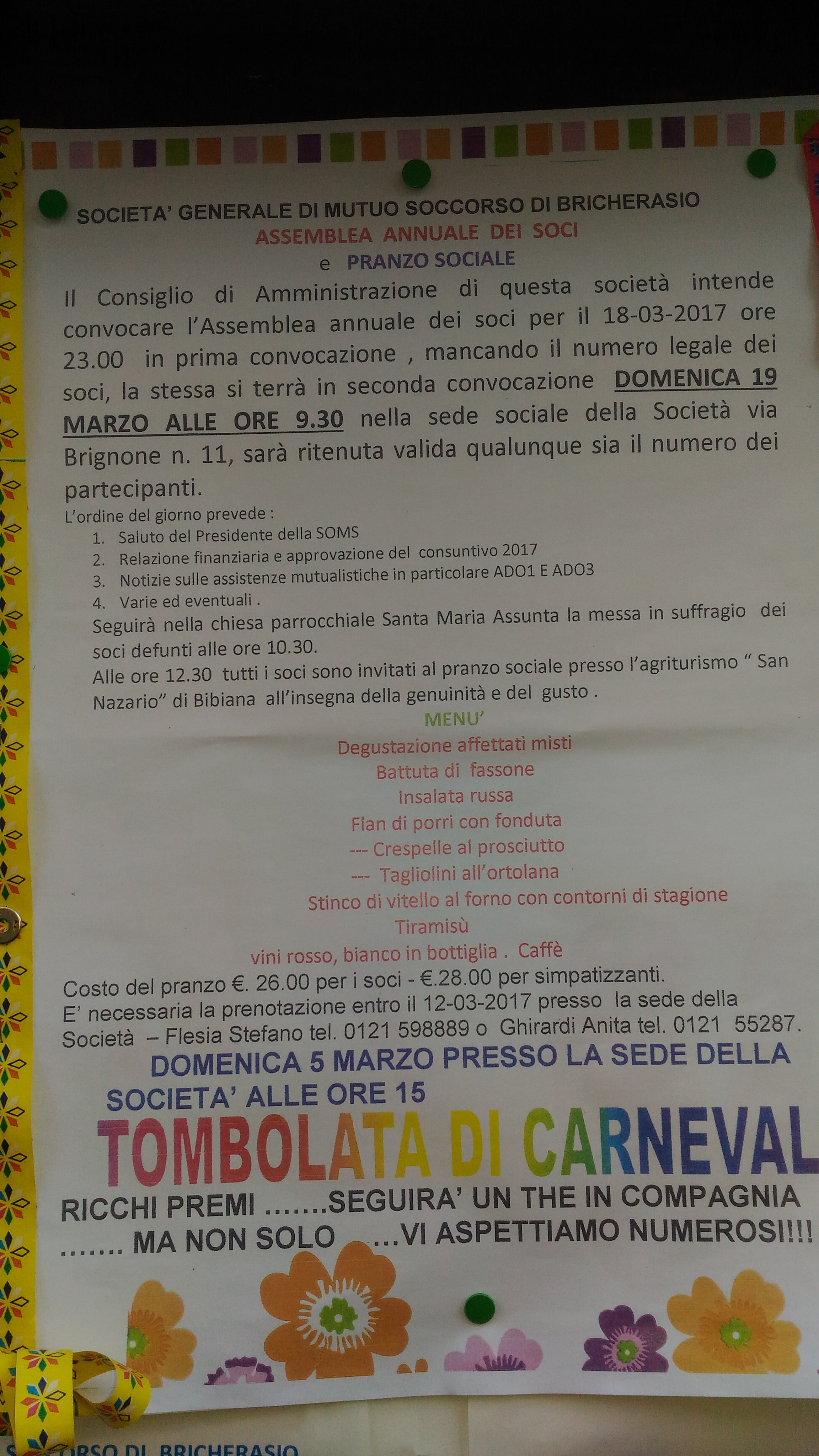 La Società di Mutuo Soccorso di Bricherasio indice per le ore 9,30 di domenica 19/3 nella sede di Via Brignone l’assemblea annuale dei soci con all’ordine del giorno la relazione finanziaria, l’approvazione del consuntivo 2017 e le notizie sulle assistenze mutualistiche in corso. Segue la Santa Messa celebrata nella Parrocchia di Santa Maria a Bricherasio in suffragio dei soci defunti. Alle ore 12,30 tutti i soci sono invitati al pranzo sociale all’Agriturismo San Nazario di Bibiana al costo di 26 € per i soci e di 28 € per i simpatizzanti. Informazioni alla sede della Società o telefonare a Flesia Stefano allo 0121/598889 oppure Ghirardi Anita tel 0121/55287.