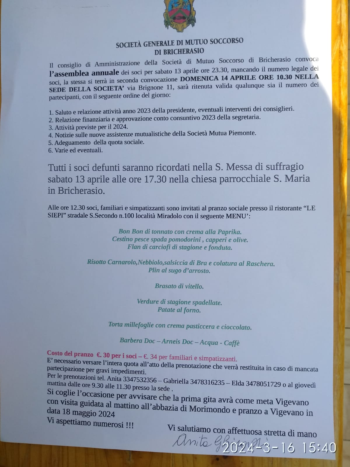 Il Consiglio di Amministrazione della Società di Mutuo Soccorso di Bricherasio convoca per le ore 10,30 di Domenica 14 aprile nella propria sede di Via Brignone 11 l’assemblea annuale dei soci. All’ordine del giorno il saluto della Presidente Anita Ghirardi con eventuali interventi dei consiglieri, la relazione delle attività svolte e quella finanziaria con l’approvazione del bilancio consuntivo 2023, le notizie sulle nuove assistenze mutualistiche della Società Mutuo Piemonte e le attività previste per l’anno in corso (fra cui la gita già programmata per sabato 18 maggio a Vigevano e la gita d’estate a fine agosto) . Alle ore 12,30 si svolge il pranzo sociale al Ristorante Le Siepi in stradale San Secondo a Miradolo al costo di 30 € per i soci e di 34 € per familiari e simpatizzanti. Per prenotazioni al convivio rivolgersi ad Anita Ghirardi al numero 3347532356, a Gabriella al 3478316235, a Elda al 3478051729 oppure in sede il giovedì mattina dalle 9,30 alle 11,30. Per esigenze amministrative è necessario versare l’intera quota all’atto della prenotazione, che sarà restituita in caso di mancata partecipazione per gravi impedimenti.